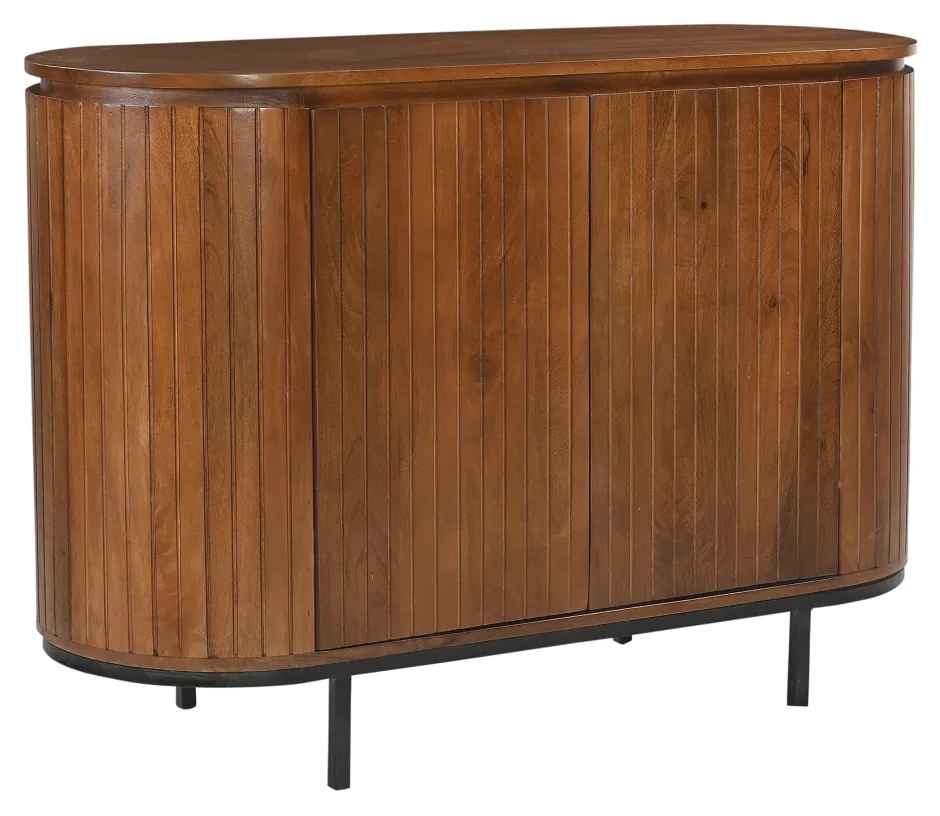 Een dressoir is meer dan zomaar een meubelstuk – het combineert stijl en functie en past harmonieus in elke kamer. Het dressoir met twee deuren, gemaakt van massief mangohout in een natuurlijke afwerking, maakt indruk met zijn moderne en toch tijdloze ontwerp. De romp van massief mangohout laat de warme, natuurlijke nerven van het hout bijzonder mooi uitkomen. Mangohout is niet alleen duurzaam, maar ook extreem robuust en duurzaam, waardoor dit dressoir een investering is die je jarenlang zal vergezellen. De zwarte metalen poten vormen een modern accent en geven het meubel een zwevende lichtheid. De fronten in lattenlook zijn een echt hoogtepunt en creëren een spannende visuele dynamiek. Dit detail geeft het dressoir een elegante structuur en maakt het een blikvanger in elke woon- of eetkamer. Achter de twee deuren ligt een doorlopende vloer die het interieur in twee ruime vakken verdeelt. Boeken, servies, documenten of decoratieve voorwerpen vinden hier hun plek – alles is georganiseerd en toch snel bij de hand. De gesloten fronten zorgen ervoor dat de inhoud beschermd blijft tegen stof en dat de sfeer opgeruimd blijft. De afgeronde hoeken van het dressoir zijn niet alleen een visueel detail, maar zorgen ook voor extra veiligheid – ideaal voor huishoudens met kinderen of in ruimtes met veel beweging. Tegelijkertijd onderstrepen ze de zachte, organische designtaal van de meubels. In de woonkamer als stijlvolle opbergplaats voor media en decoratie, in de eetkamer voor het opbergen van servies of zelfs in de gang als elegante opbergruimte – dit dressoir is een echte allrounder. Dankzij het eenvoudige maar opvallende ontwerp past het moeiteloos in verschillende interieurstijlen, van Scandinavisch tot industrieel.