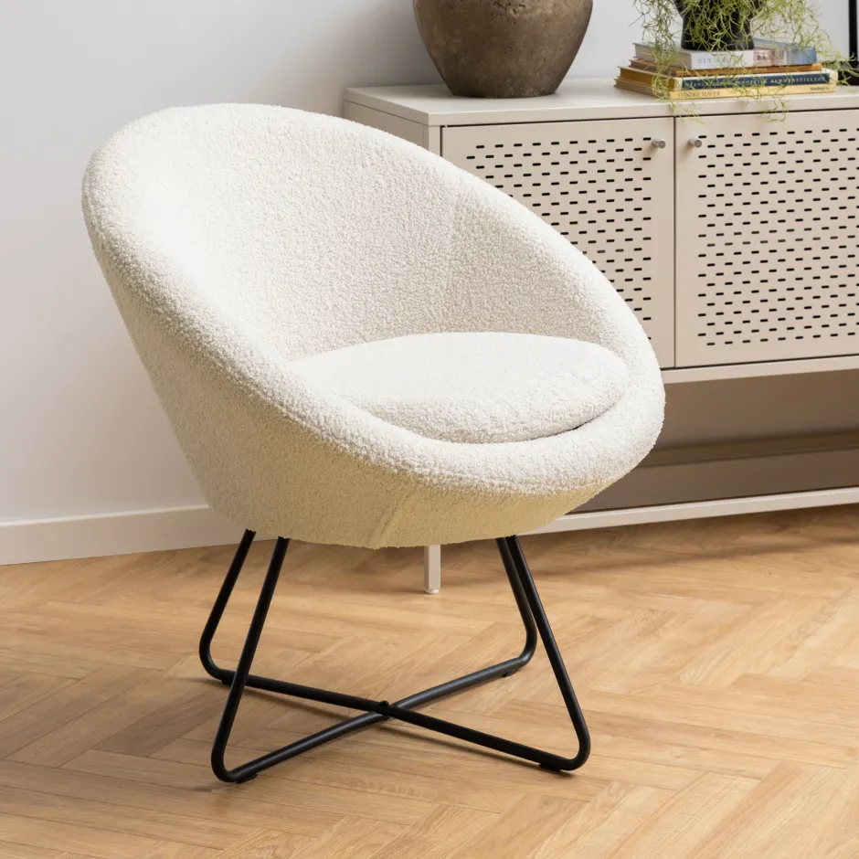 Verhoog de gezelligheid in je huis met deze ronde lounge stoel. Zijn opvallende uiterlijk maakt de crème stoel allesbehalve traditioneel. Zo’n ontwerp creëert een visueel verschilpunt en geeft je huis een uniek gevoel. Het is volledig gevoerd en heeft een zitkussen om je comfortabel te houden, terwijl de zwarte metalen kruisvoet stabiliteit garandeert. Het afscheid nemen en opstaan van deze stoel kan moeilijk zijn omdat hij zo zacht en pluizig is.