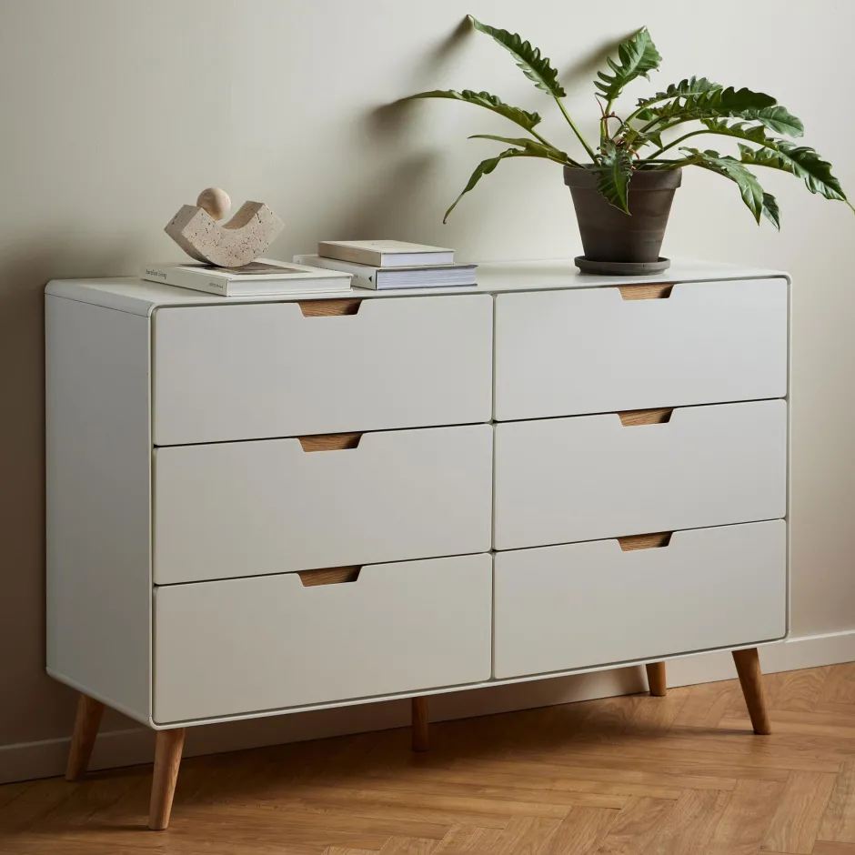 De taps toelopende poten in eikenkleur geven Roselle een verfijnd en tijdloos karakter. Dankzij de strakke lijnen en harmonieuze kleurcombinatie past deze ladekast goed in een modern en Scandinavisch interieur. Roselle is een stijlvolle opbergoplossing die elegantie en eenvoud perfect belichaamt.
