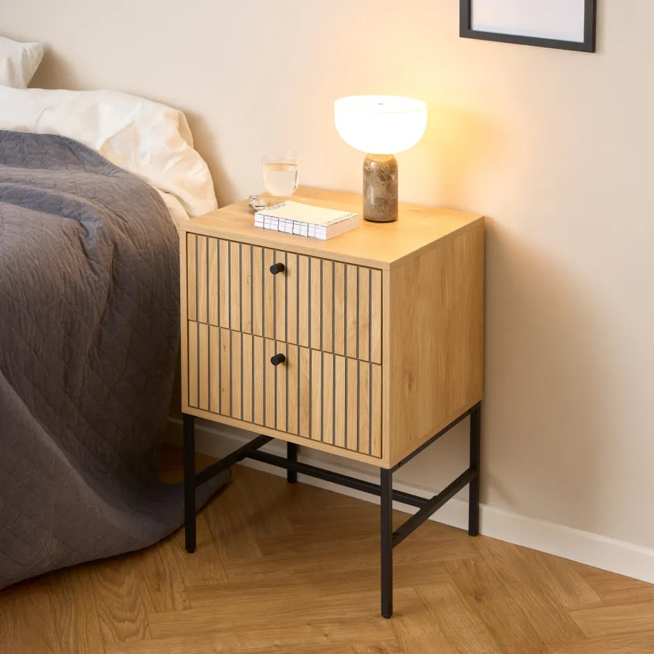 Nachtkastje ‘Davon’ van Bendt combineert natuurlijke uitstraling met modern design. Het kastje is uitgevoerd in melamine met een eikenlook, wat zorgt voor een warme en tijdloze sfeer in de slaapkamer. De twee laden zijn voorzien van decoratieve lamellenfrontjes, die structuur en karakter toevoegen aan het ontwerp.