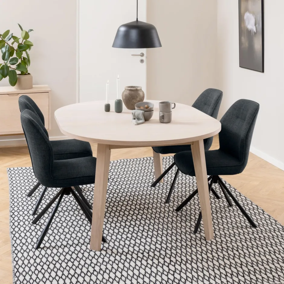 Deze ronde eettafel is een moderne kijk op een klassiek Scandinavisch ontwerp. Het slanke profiel heeft een lichtgewicht en eigentijdse uitdrukking. Het tafelblad is versierd met wit gepigmenteerd geolied eikenfineer en heeft een natuurlijke textuur, terwijl de stevige eikenhouten poten de tafel een modern randje geven. Hij biedt comfortabel plaats aan 4/6 personen zonder/met uitschuifblad.