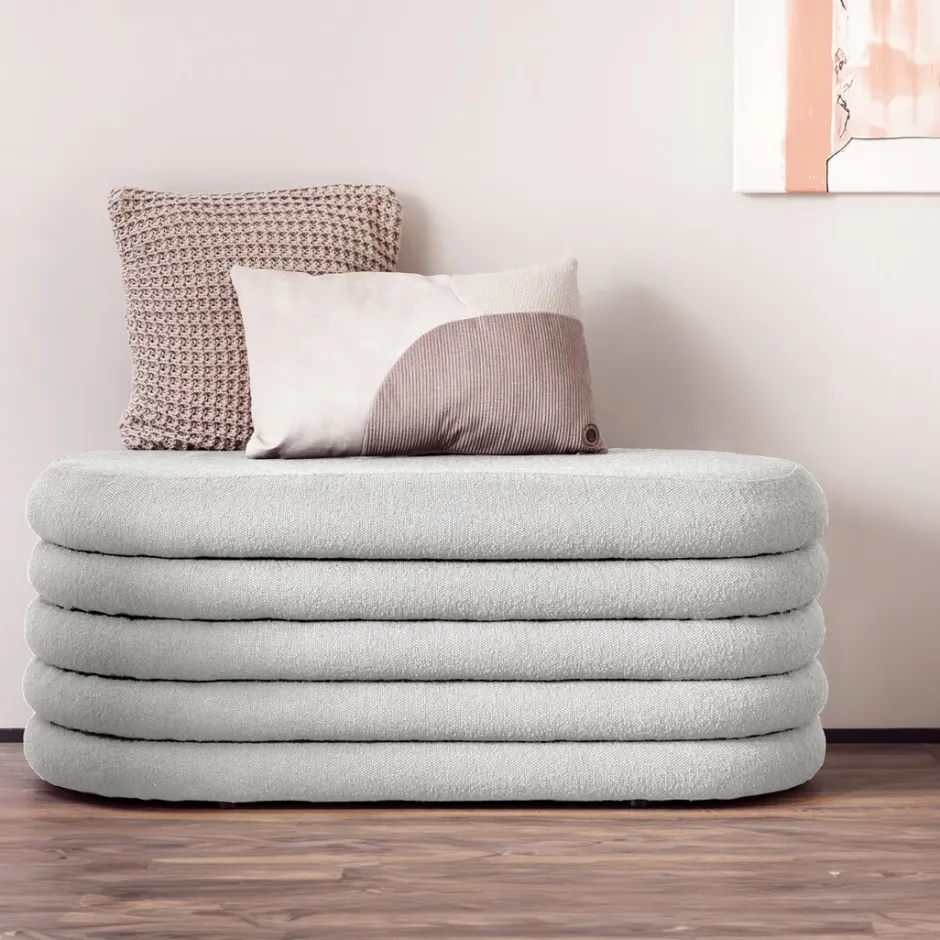Slimme opbergoplossing in een geavanceerd ontwerp. Deze gestoffeerde kruk in een moderne bouclé-look slaat niet alleen visueel een goed figuur. Het bovenste element van de bank kan worden verwijderd, waardoor de binnenkant van de kruk een praktische opbergoplossing wordt. Met deze bank creëer je niet alleen extra zitplaatsen, maar organiseer je ook stijlvol je woon- en slaapgedeelte. Het trendy bouclé accent in jaren 70 retro design is bijzonder indrukwekkend als het aan het voeteneinde van het bed wordt geplaatst. De levering is helemaal ongecompliceerd – het item wordt volledig gemonteerd geleverd. Gewoon uitpakken, neerzetten en genieten van je nieuwe lievelingsstuk.