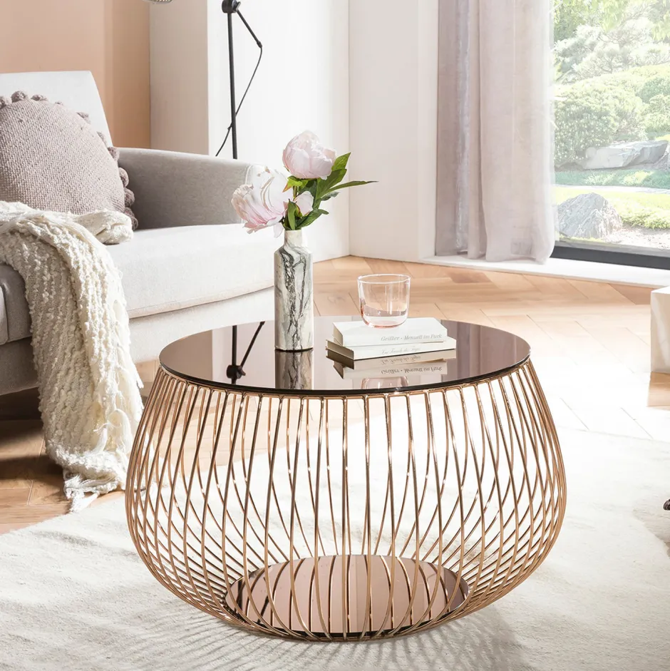 De ronde salontafel combineert modern design met een dosis extravagantie. Het tafelblad in roségoud past perfect bij het goudkleurige metalen frame. De banktafel biedt voldoende opbergruimte voor bijvoorbeeld tijdschriften, fruit, knabbels of een bloemenvaas. Dankzij het aantrekkelijke ontwerp en de ronde vorm is deze salontafel met veel meubels te combineren en zal hij ook in jouw huis een passende plaats vinden. Het oppervlak van de salontafel is zeer gemakkelijk schoon te maken en slijtvast. Klein vuil kan worden verwijderd met een licht vochtige doek.