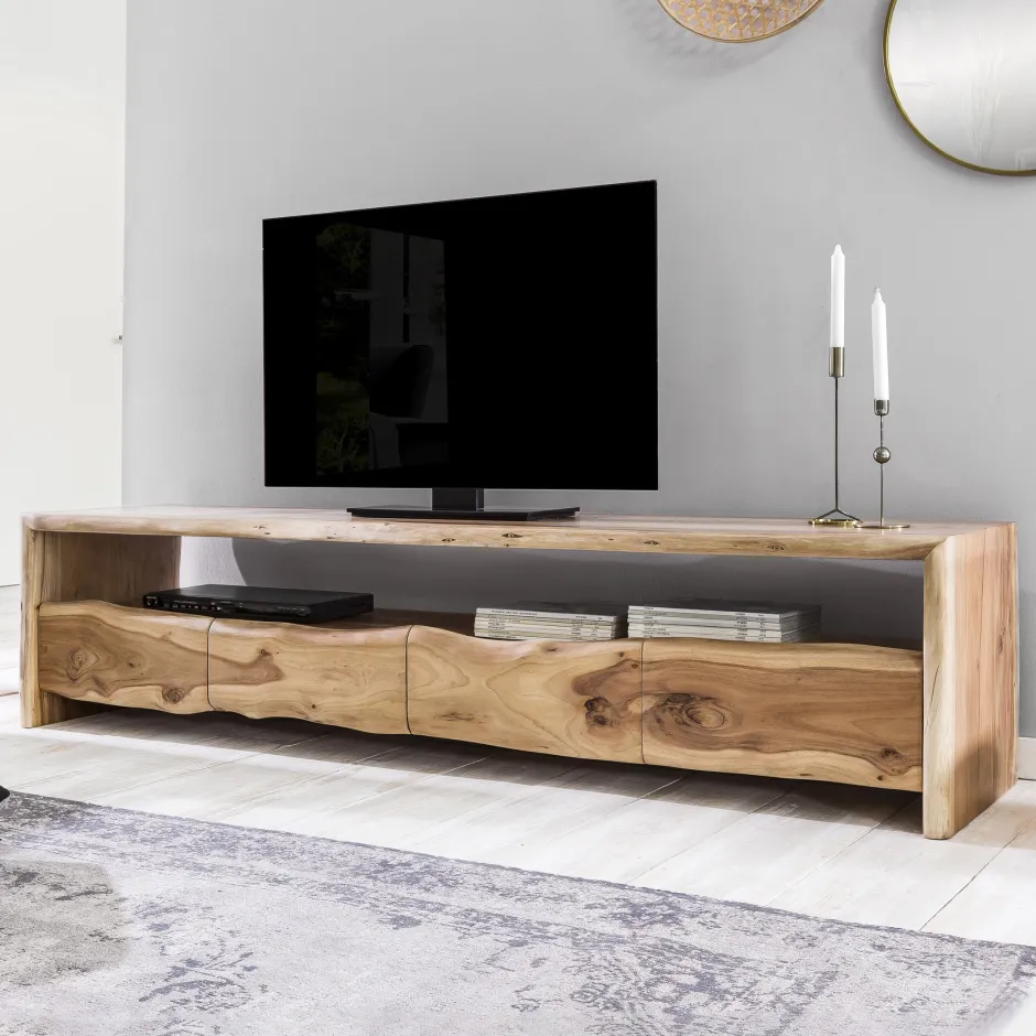 Massief acacia met dat zekere iets, natuurlijk gegroeide vormen van hout worden het stijlbepalende element van de meubels – ja, de natuur is hier niet getrimd. Daarom zit er veel kunst in de productie, want je moet elke plank zorgvuldig lezen en de juiste rangschikking ten opzichte van elkaar vinden, zodat er een samenhangend beeld ontstaat zoals hier. Uiteindelijk is geen van deze eindproducten hetzelfde, zodat elk van deze fascinerende meubelstukken gegarandeerd uniek is. Als je van het echte werk houdt en op zoek bent naar iets bijzonders, dan ben je hier aan het juiste adres. 3 lades en het ruime open vak bieden diverse opbergmogelijkheden.