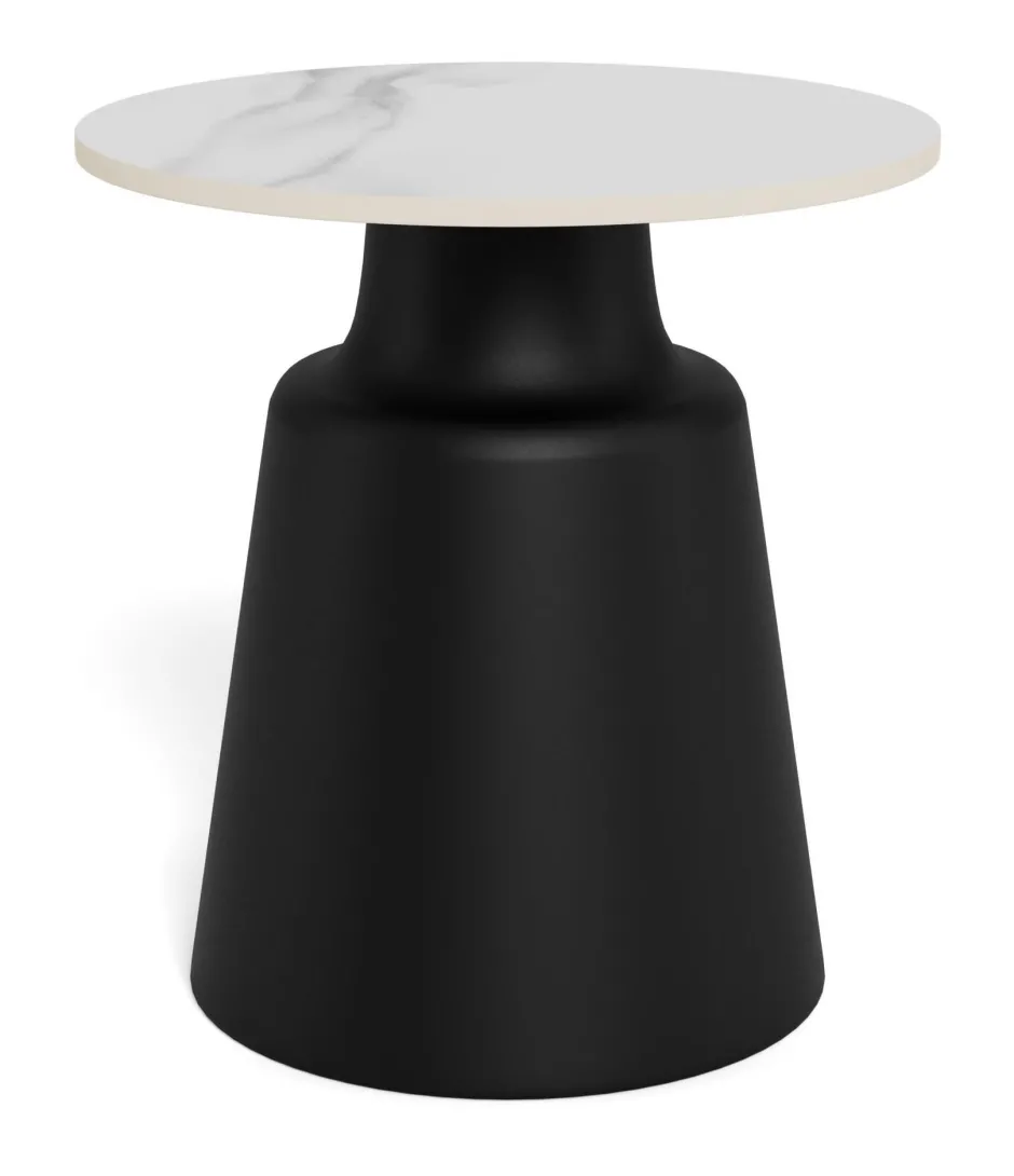 Deze ronde salontafel stapt met zijn opvallende uitdrukking uit de conventies. Met een rond blad van keramiek en een zwarte robuuste stalen kolomvoet brengt hij een levendige energie in de woonkamer. Het witte blad doet denken aan marmer met zijn aderen, maar is hitte- en krasbestendig.