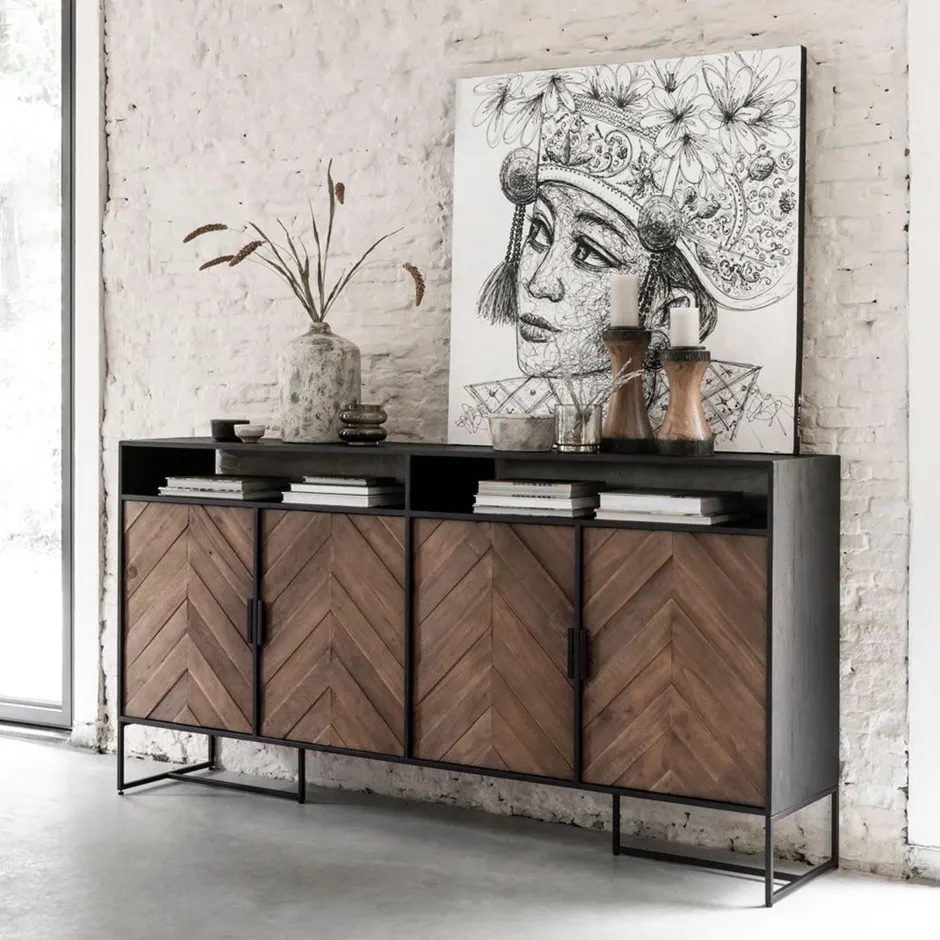 Dit prachtige dressoir valt op dankzij het vissengraat patroon en de stoere stalen details. Dressoir Criss Cross beschikt over 4 deurtjes en twee open vakken en heeft een afmeting van 100x200x40 cm. De speelse pootjes maken dit meubel af.