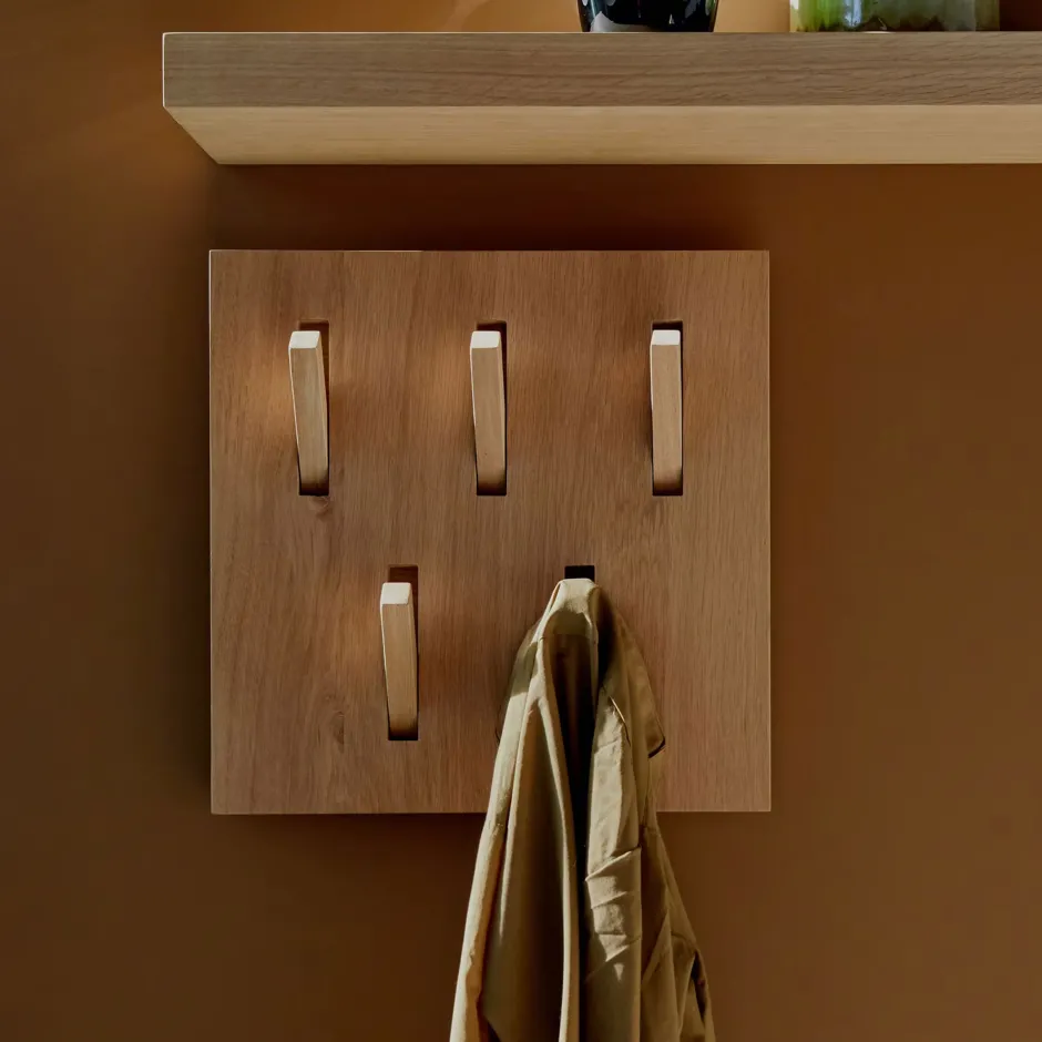 De eiken Utilitile combineert vorm en functie perfect. De minimalistische massief eiken kapstok is een geweldige aanvulling op iedere gang om jassen en accessoires aan op te hangen.