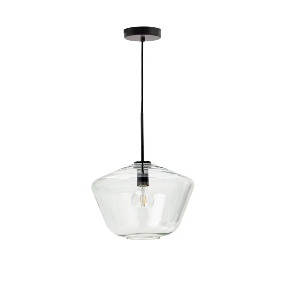 - Plafondlamp gemaakt van glas met een transparante afwerking en zwarte montage.