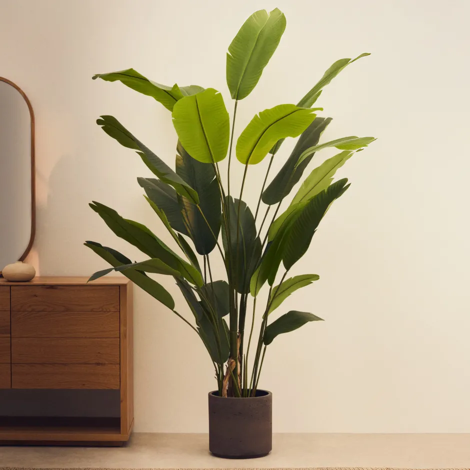 Wij zorgen ervoor dat je je huis groener kunt maken met planten zonder dat je je zorgen hoeft te maken over het water geven. Daarvoor moeten we wel op de kleinste details letten. Met zijn verschillende kleurtinten en getextureerde stam is onze boom Musa (banaan) bijna niet van echt te onderscheiden.