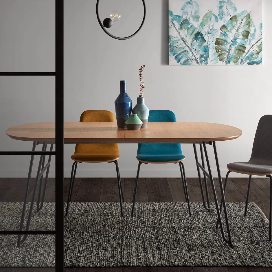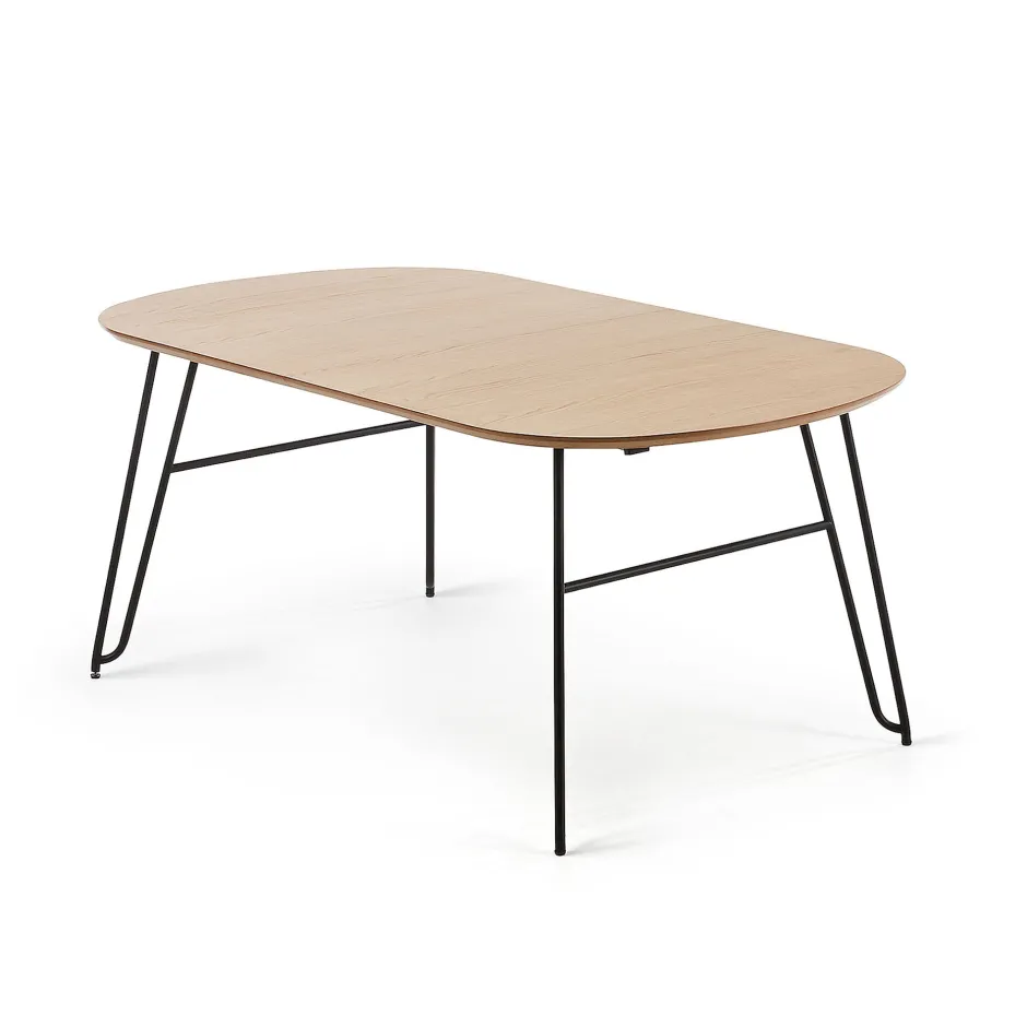 Uitschuifbare ovale tafel met bovenkant van natuurlijk eikenfineer. Poten in zwart metaal. Twee verlengstukken van elk 40 cm. Maximale lengte van de tafel 220 cm.