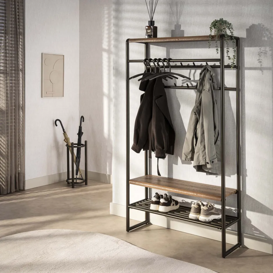 Garderobemeubel Luno bestaat uit een stalen frame, gepoedercoat in brons. De afgeronde hoedenplank en schoenenplank zijn…