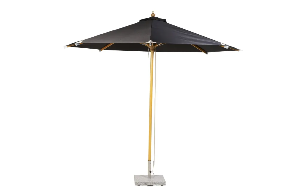 Luiza – een smaakvolle en onafhankelijke parasol in een iets hoger en breder model! De stof is in een aardebruine kleur en het frame in stijlvol hout. Plaats hem bij de eetgroep en bepaal zelf wanneer je schaduw wilt – perfect geschikt als zonwering en als stijlvol detail bij het buitenmeubilair. Afmetingen: 3x3m