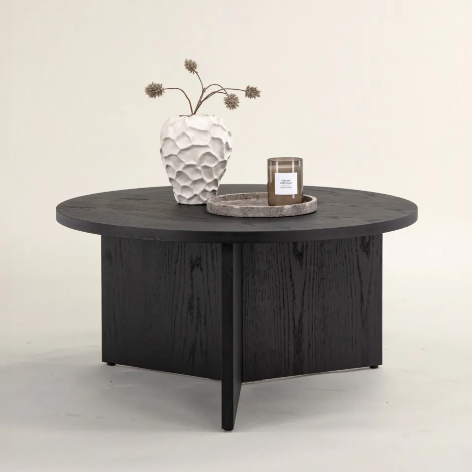 Tammera is een stijlvolle salontafel met een algemeen ontwerp in zwart MDF en wordt geleverd in twee verschillende oppervlaktelagen en afmetingen; kies tussen een heldere whitewashed afwerking of een matzwarte look. Het ronde bovenblad is zwart van MDF en de poten zitten in het midden onder de tafel bij elkaar. Het consistente algemene ontwerp geeft je een salontafel die de tand des tijds doorstaat en gemakkelijk te combineren is met andere meubels. Creëer een blikvanger die indruk maakt en til je inrichting naar een hoger niveau!