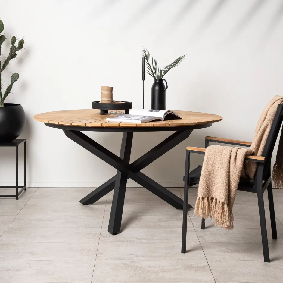 Constantina – Een ronde eettafel met iedereen gelijk: Mooi, slim en duurzaam! Hier kun je geliefden smal rond een duurzame eettafel in heerlijk design zetten en niemand loopt het risico om op de rand te komen. Het tafelblad is van prachtig teakhout en het onderstel van zwart metaal. Richt in in de buitenkamer of op het balkon en geniet deze zomer van maaltijden in de buitenlucht!