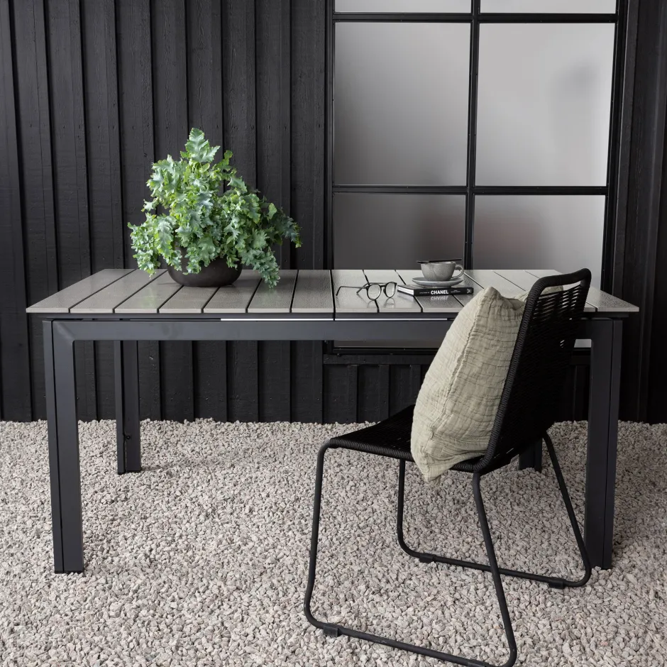 Ethen – een rechthoekige eettafel die kan worden uitgeschoven als er meer zitplaatsen nodig zijn: hier zullen alle dierbaren van houden! Het tafelblad is van grijs Aintwood en de tafelpoten van metaal: twee duurzame materialen waarmee je een duurzame eettafel voor buiten hebt. Zet er een paar comfortabele eetstoelen bij en je hebt een complete eetgroep voor zomerse buitenmaaltijden.