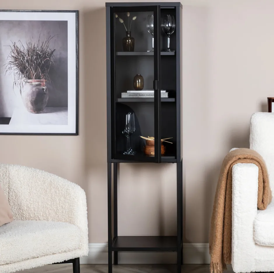 Vitrinekasten zijn een populaire en praktische toevoeging aan het interieur! Deze kast uit de Carmilla serie heeft een statige hoogte met een geheel in modern industrieel design, gemaakt van gepoedercoat zwart staal met een glazen deur. Het glas laat heerlijk licht binnen in de kast en laat alles waar je hem mee vult mooi uitkomen. Er zijn drie slimme reliëfvlakken, te gebruiken voor het opbergen van porselein, boeken of te decoreren met mooie interieurdetails. Afmetingen: Lengte: 40,5 cm, breedte: 35 cm, hoogte: 150 cm. Lichtere montage vereist.