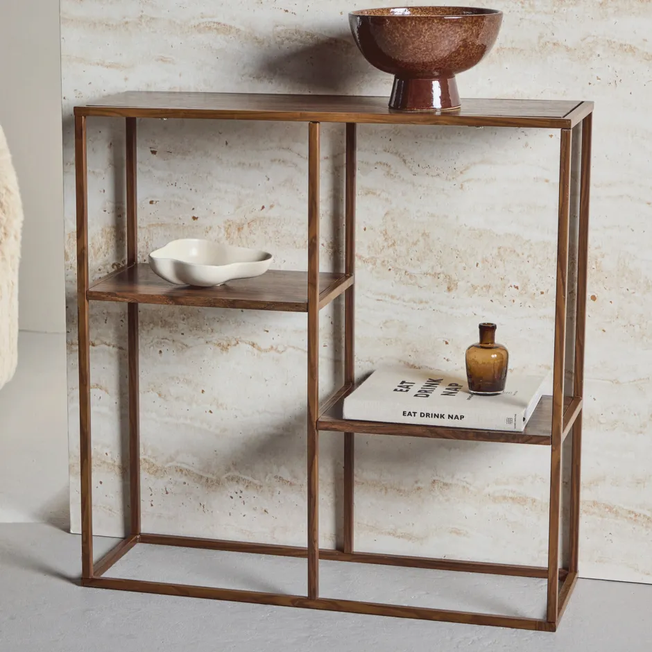 De plank heeft twee open niveaus op verschillende hoogtes en een bovenblad, waardoor hij zowel praktisch als decoratief is. De gevarieerde hoogte biedt ruimte voor alles van boeken en decoraties tot planten of alledaagse voorwerpen.