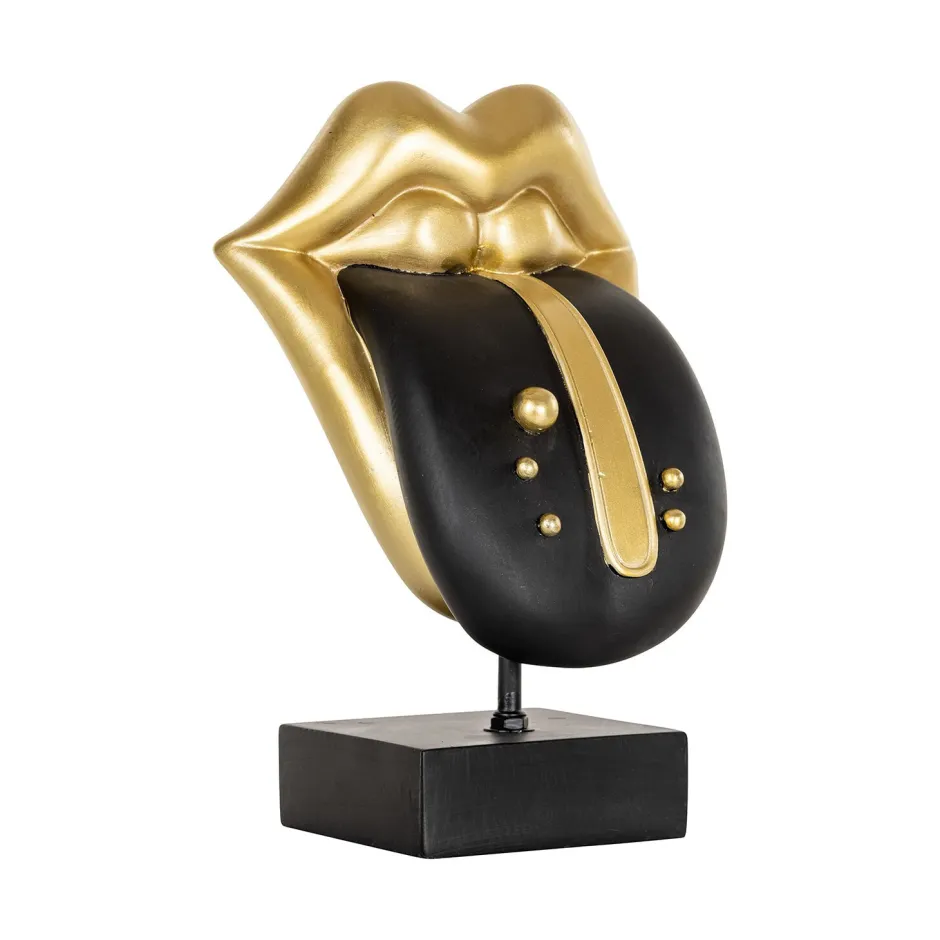 De Tongue is een gedurfd en eigentijds decoratieobject dat een opvallende toevoeging is aan elk interieur. Dit kunstzinnige stuk combineert een stijlvolle zwarte en gouden afwerking, wat een luxueuze en moderne uitstraling geeft. De sculptuur is vormgegeven met aandacht voor detail en rust stevig op een zwarte basis, waardoor het perfect is voor plaatsing op een dressoir, plank of bijzettafel. Met zijn unieke en expressieve ontwerp brengt de “Tongue” een vleugje humor en artistieke flair in elke ruimte, ideaal voor wie houdt van gedurfde, creatieve decoratie.