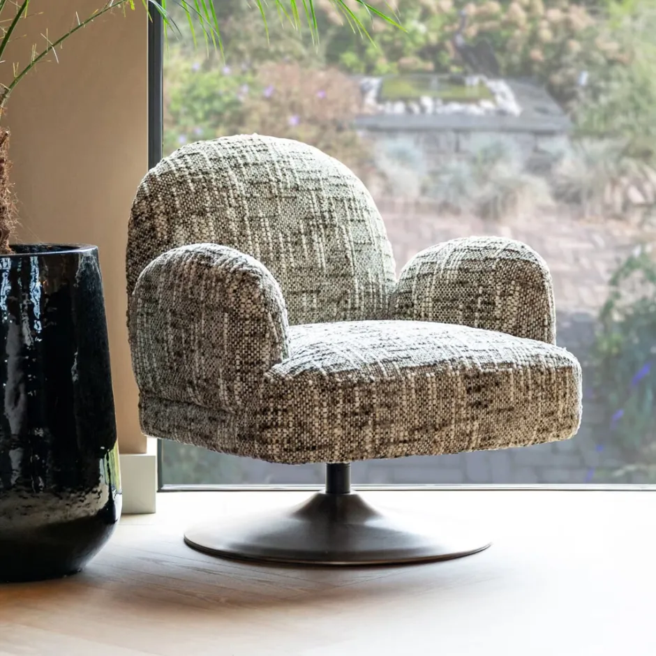 Fauteuil Kagney is een draaibare armstoel met vaste kussens en een zachte, uitnodigende vorm. Bekleed met Omara brown, ontworpen voor zowel comfort als loungen.