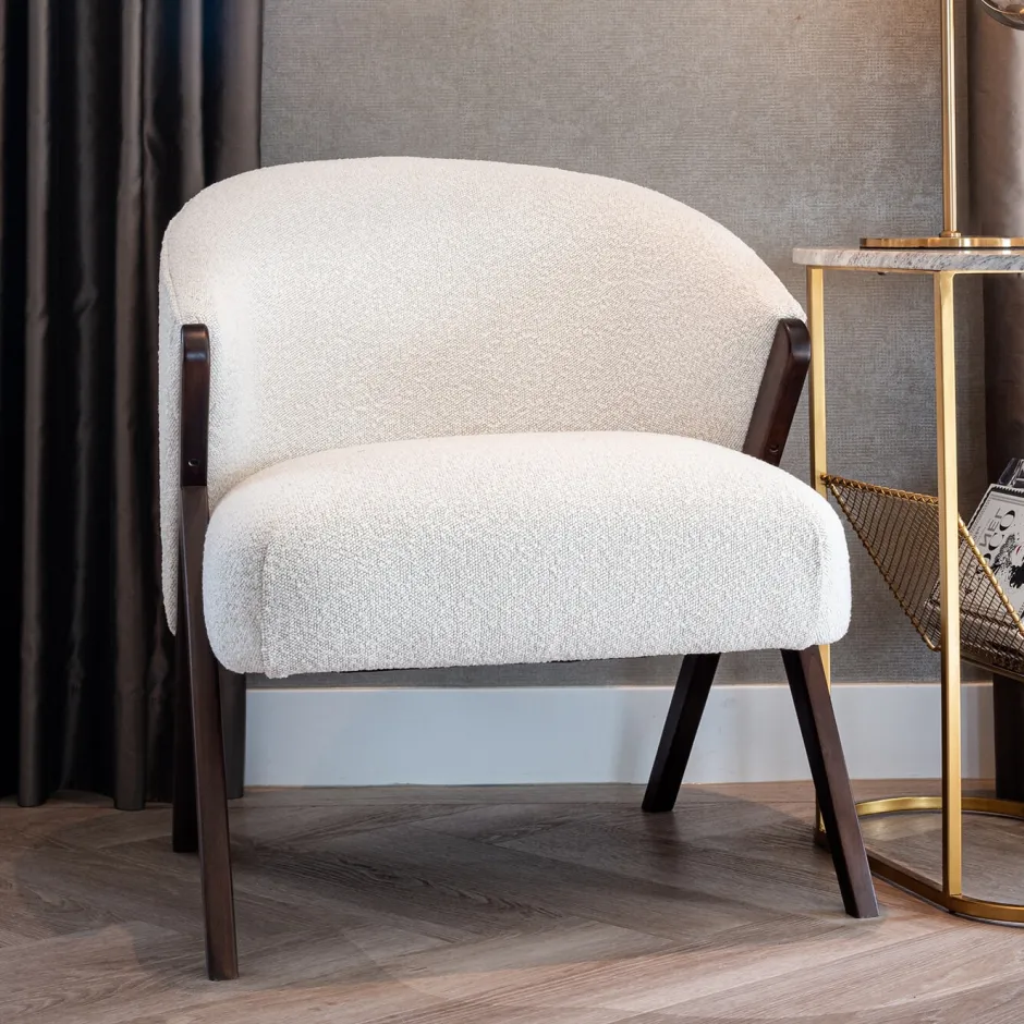 De perfecte mix tussen stijl en comfort, dat is onze fauteuil Mia. De combinatie van houten poten en de bouclé stof zorgen voor contrast en elegantie. Een designstuk dat gemakkelijk te combineren is in elke decoratieve stijl.