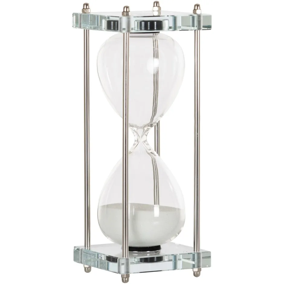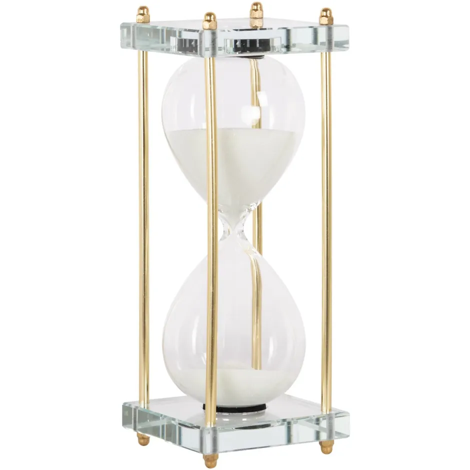 Decoratief object Gigi is een zandloper van glas met gouden metalen details en zachtgekleurd zand. Een verfijnd en tijdloos accent voor planken of bijzettafels.