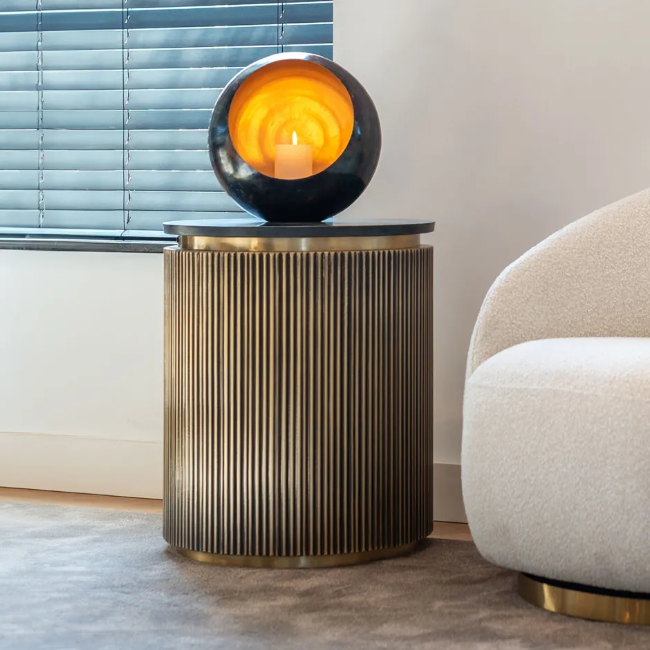 Bijzettafel Ironville 50Ø is een unieke bijzettafel is Mid-Century Modern stijl (jaren zestig). Het antieke messingkleurige ribbelmotief is gecombineerd met een zwart marmeren blad.