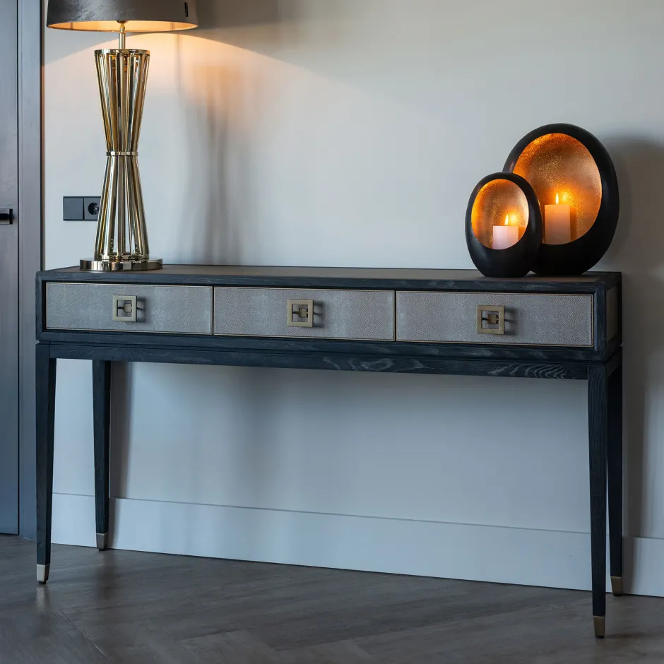 | Materiaal: | Zwart eiken blad en poten, segrijn/faux roggehuid van PU leder en mat gouden metalen accenten |