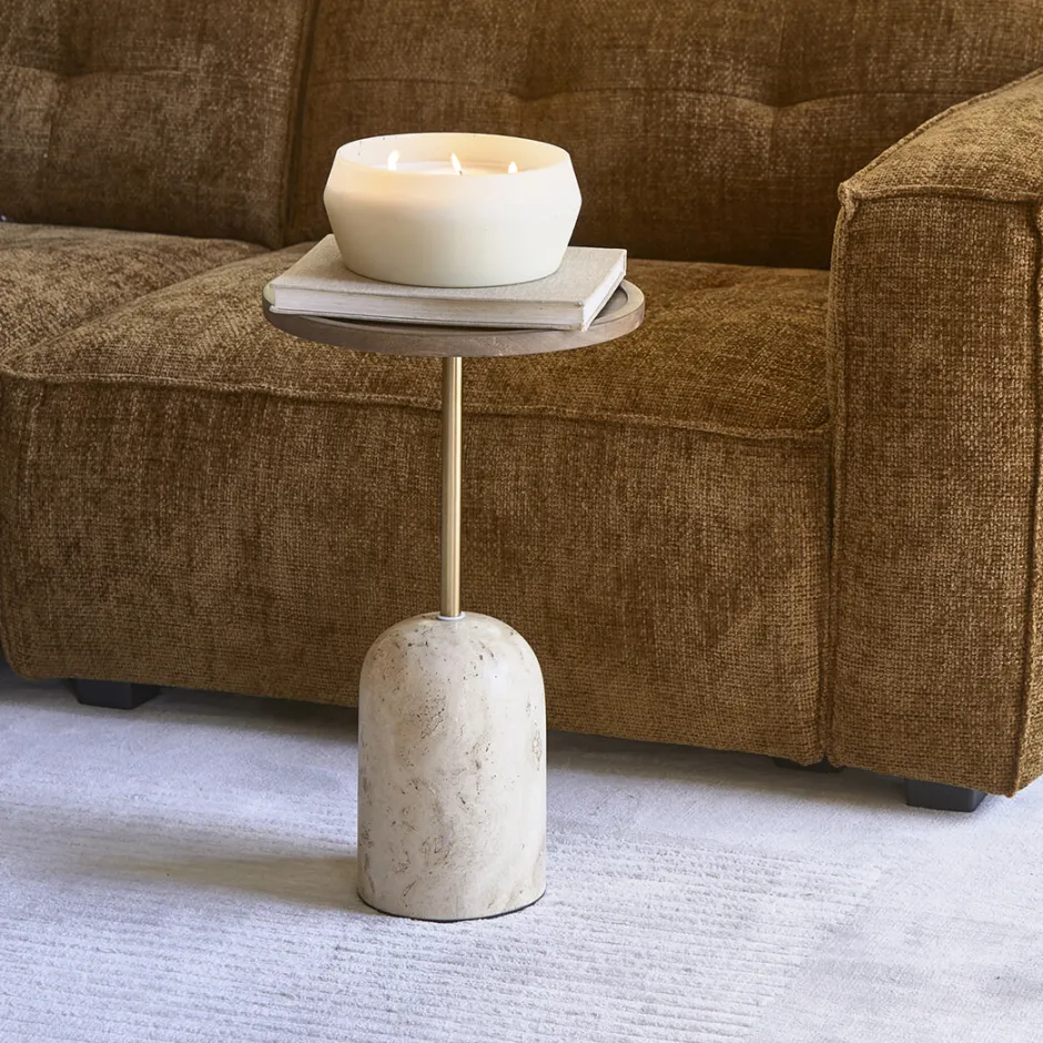 Design en gemak gaan moeiteloos samen met de Malibu bijzettafel. Het gebruik van mangohout, metaal en travertin zorgt voor een prachtige mix van texturen en kleuren. De base van travertin straalt design uit en de warme tinten van het mangohouten blad maken dit samen een unieke salontafel. Met een diameter van 35 cm en een hoogte van 55 cm past deze tafel perfect in elk interieur! Er is een bijpassende salontafel verkrijgbaar.