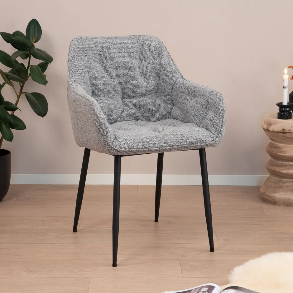 Geef je eethoek karakter met dit tijdloze silhouet. Gestoffeerd in een beige bouclé stof is deze eetkamerstoel geschikt voor een lang diner. De tufting details voegen textuur en structuur toe aan de zitting. Hij wordt ondersteund door ronde zwarte poten van staal.