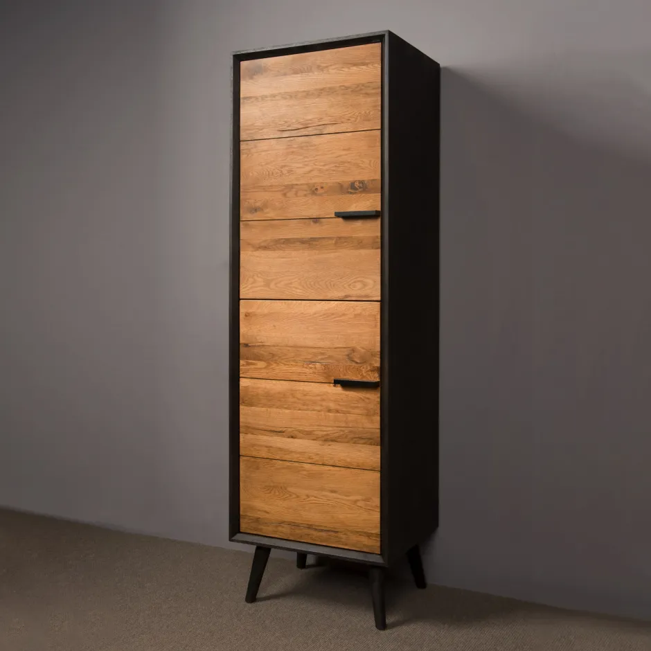 Bresso is een opvallende verschijning, tussen de vele industriële woonprogramma’s. De collectie is vernieuwend en kenmerkt zich door de unieke indeling, de massief eiken deuren en de retro poot. De deuren en lades sluiten met een soft-close systeem. De kleurcombinatie, bestaande uit twee warme bruine tinten, geeft de meubelen zijn charme.