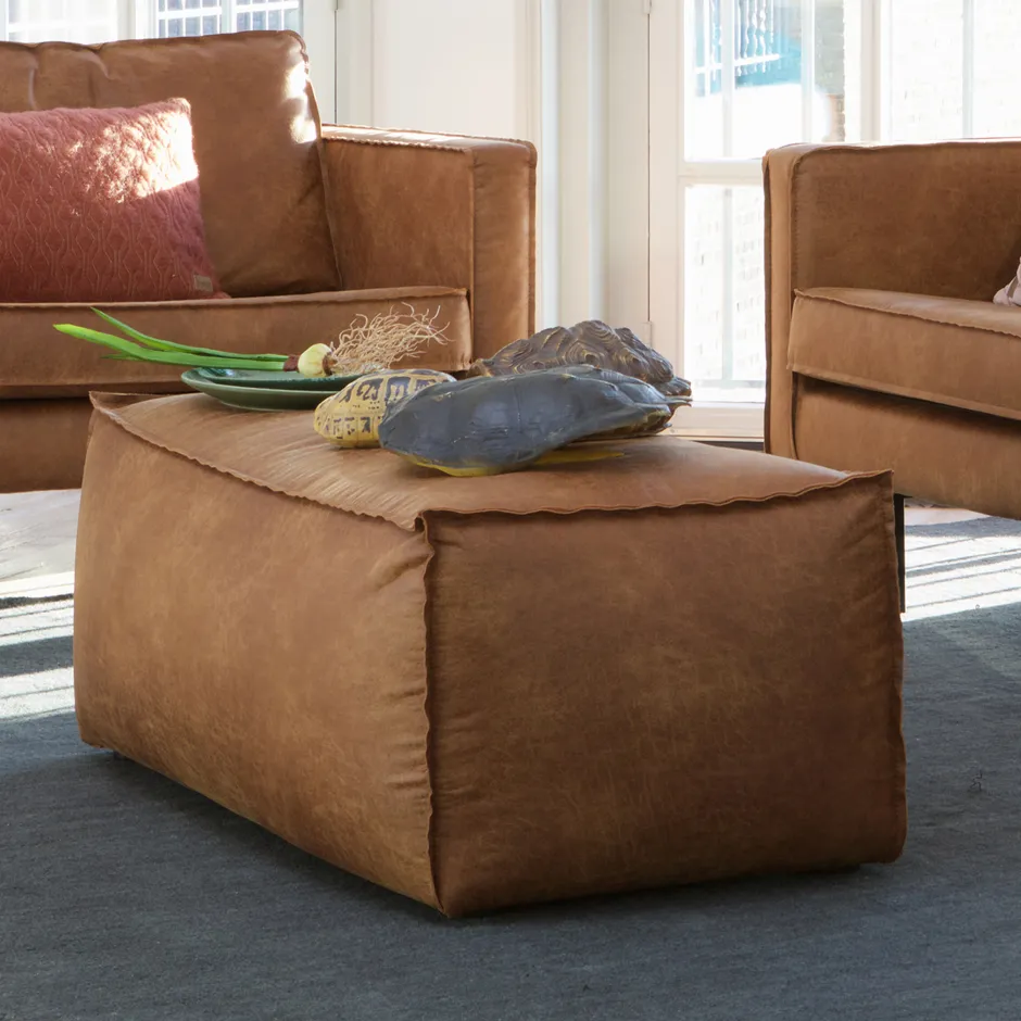 - De poef beschikt over een stoere stof, Recycle leer in de kleur cognac.