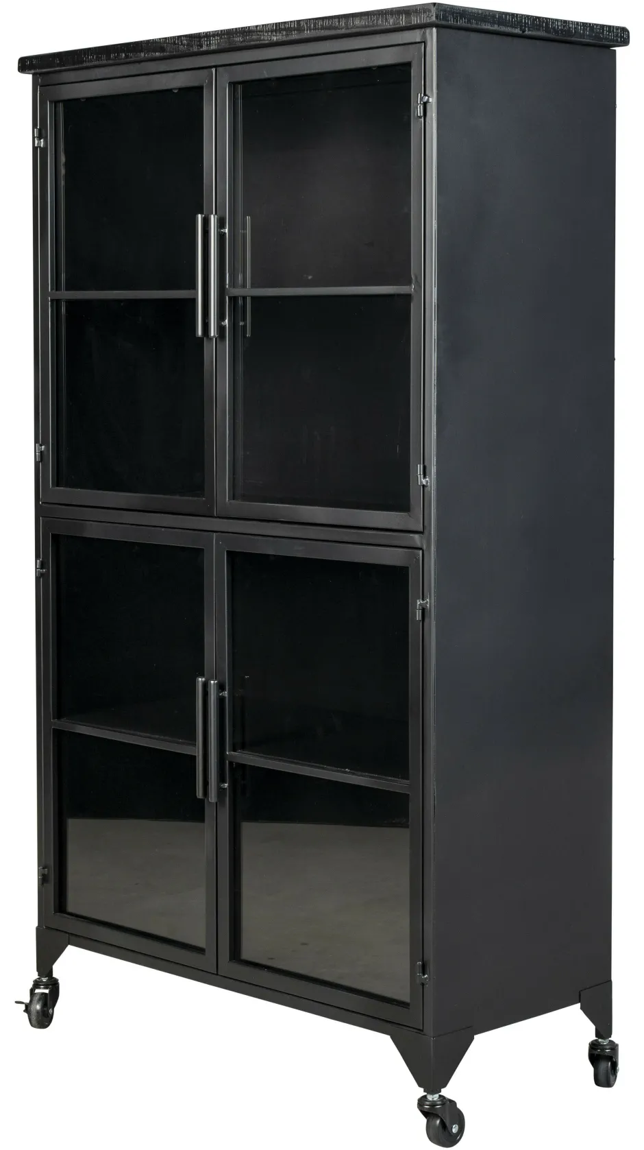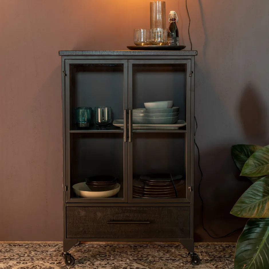 | Materiaal: | Gelakt massief MDF en dennenhouten top en lade, gepoedercoat ijzer en glazen deuren |