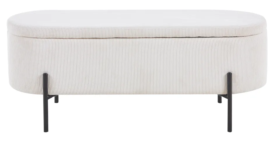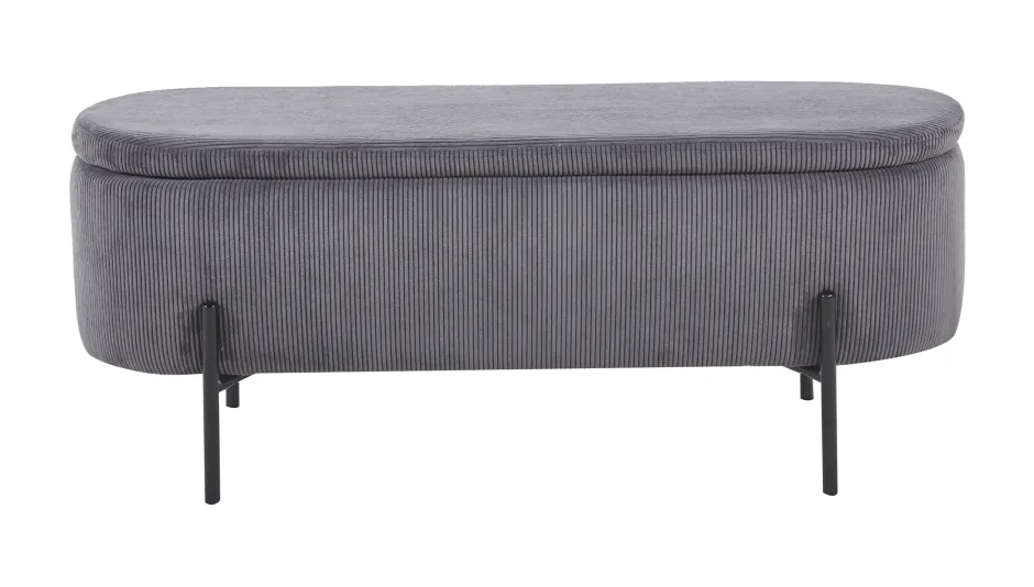 Als je op zoek bent naar Scandinavisch design met praktische voordelen, dan is deze bedbank met trendy koordhoes de juiste keuze. De gestoffeerde kruk scoort niet alleen met zijn vooruitstrevende ontwerp, maar biedt ook een slimme opbergfunctie achter het opklapbare deksel. Of het nu gaat om dekens, dekbedovertrekken of kleding – je kunt op een stijlvolle manier orde scheppen in de bedbank en rondslingerende spullen opbergen. De zachte corduroy stof geeft de bedbank een moderne uitstraling en zorgt voor een interessante look met de karakteristieke naden. Het design frame met hoge poten is gemaakt van gepoedercoat zwart metaal en maakt de look helemaal af.