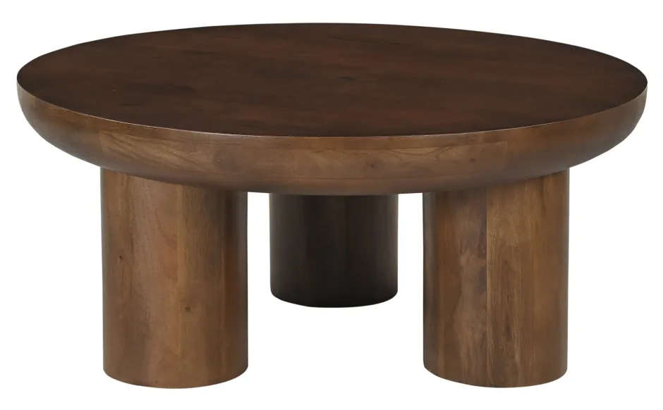 De salontafel van massief mangohout combineert een robuust ontwerp met natuurlijke elegantie. Met zijn ronde tafelblad en drie cilindervormige poten past hij naadloos in zowel moderne als rustieke woonstijlen. De combinatie van hoogwaardig materiaal en heldere vormentaal maakt het een stijlvol middelpunt in je woonkamer. Gemaakt van massief mangohout is deze salontafel bijzonder duurzaam en stabiel. Het hout wordt gekenmerkt door zijn unieke nerf en warme, bruine kleur, die elke kamer een uitnodigende, natuurlijke sfeer geeft. Elk meubel is uniek en heeft een individuele uitstraling dankzij de karakteristieke structuur van het hout. Het ronde tafelblad met een plaatdikte van ca. 10 cm geeft de salontafel een massieve en solide uitstraling. De dikke plaat biedt niet alleen stabiliteit, maar onderstreept ook het opvallende, robuuste karakter van het meubel. Hij biedt royale ruimte voor drankjes, boeken of decoraties en nodigt uit tot gezellige uurtjes in de woonkamer. De drie cilindrische poten zorgen voor betrouwbare stabiliteit en ronden het eenvoudige, moderne ontwerp van de salontafel perfect af. De heldere, geometrische vorm harmonieert prachtig met het ronde tafelblad en creëert een evenwichtig, minimalistisch totaalbeeld. De poten passen onopvallend in de kamer en laten het mangohout goed tot zijn recht komen.