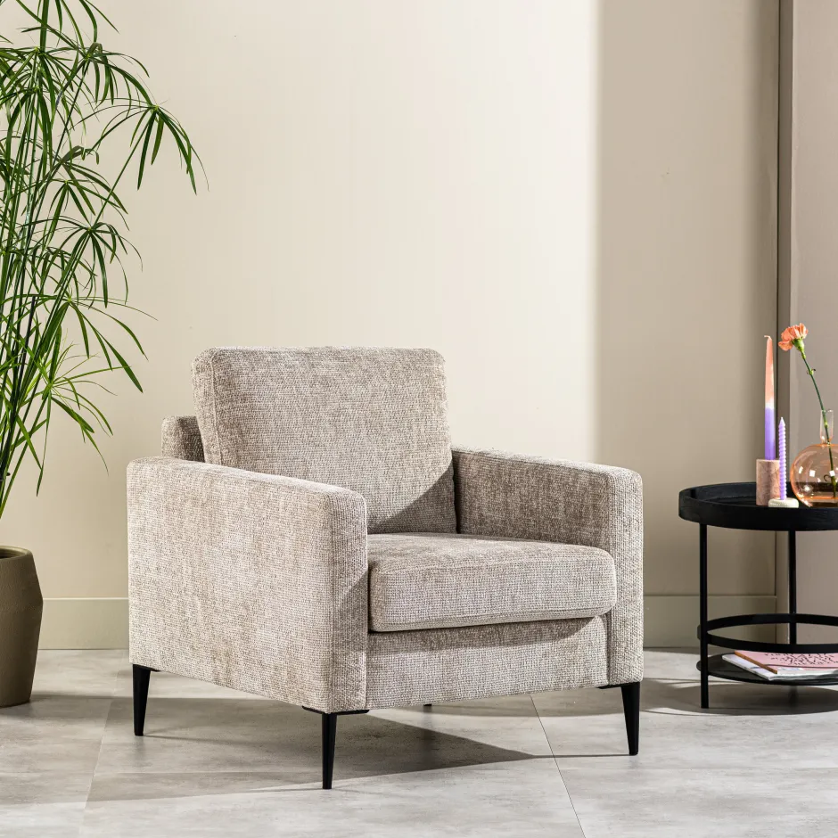 De Fauteuil Shuan Chenille voegt een moderne twist toe aan je interieur. De stoffen zitting nodigt uit om te relaxen. De stalen poten zorgen voor een strakke uitstraling. Dit veelzijdige design past perfect bij een modern, industrieel of Scandinavische interieur. Wil je meer warmte in je interieur? Combineer de fauteuil met houten meubels en zachte accessoires zoals plaids en kussens.