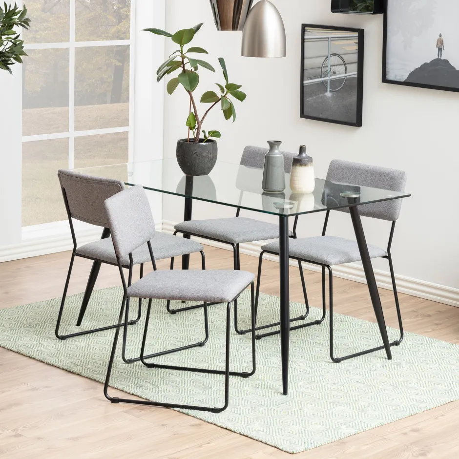 Gemaakt van metaal en glas is deze eettafel zowel visueel aantrekkelijk als duurzaam. Het heeft slanke, schuine poten en een tijdloos ontwerp. De keuze van materialen zorgt voor minimaal onderhoud van het meubilair dat gemakkelijk schoon te maken is.