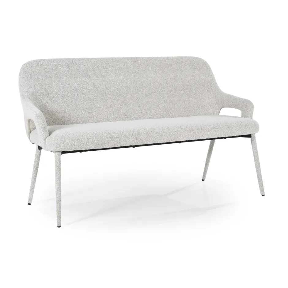 Het trendy design van de ‘Fika’ maakt het een echte eyecatcher in je interieur. De bouclé stof geeft een warme, zachte uitstraling, terwijl het volledig gestoffeerde frame zorgt voor een harmonieuze, strakke look. Dankzij de hoge rugleuning en armleuningen voelt de bank als een comfortabele cocon, ideaal voor ontspannen momenten met vrienden en familie. Of je nu een ruimtelijk statement wilt maken of een gezellige hoek wilt creëren, de eetkamerbank van By-Boo brengt stijl, comfort en verfijning samen in één uniek meubelstuk.