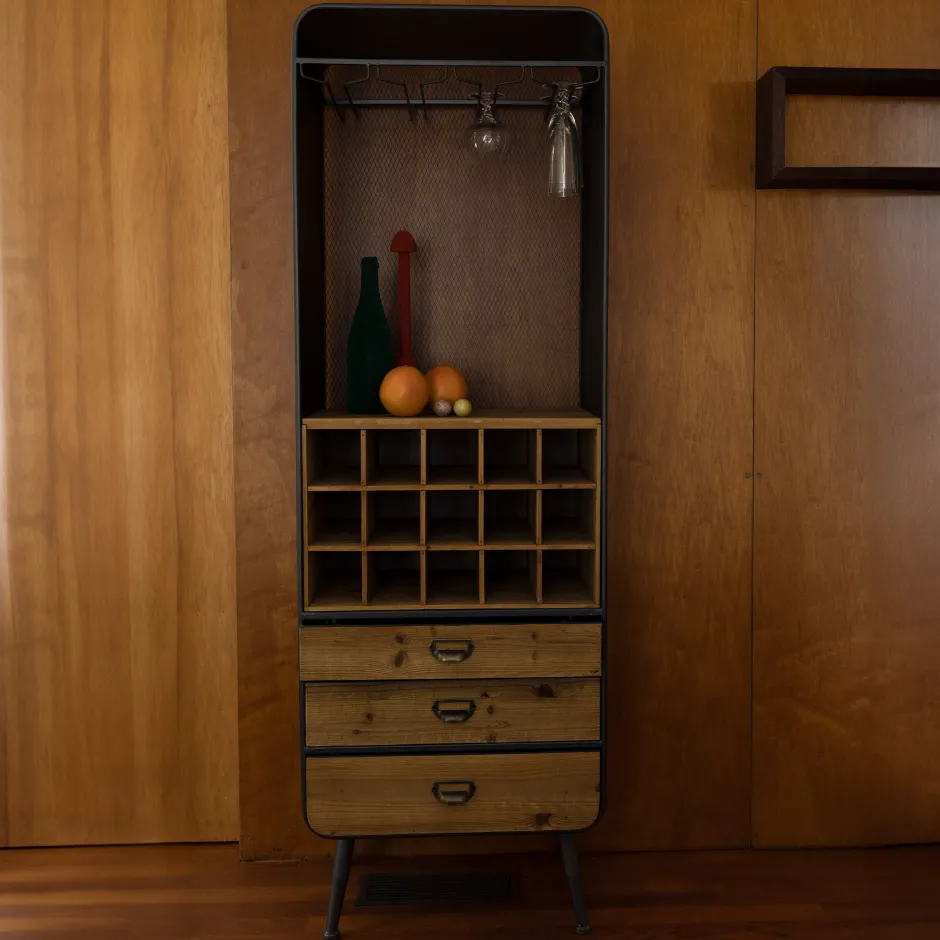 De wijnkast Vino van Dutchbone is een robuust en stijlvol meubelstuk, vervaardigd uit massief dennenhout met een antieke finish en afgewerkt met een rustiek ijzeren frame en rooster aan de achterzijde. De kast biedt drie lades voor accessoires, 15 vakken voor wijnflessen en een rek om wijnglazen op te hangen, waardoor alles overzichtelijk en netjes wordt opgeborgen.