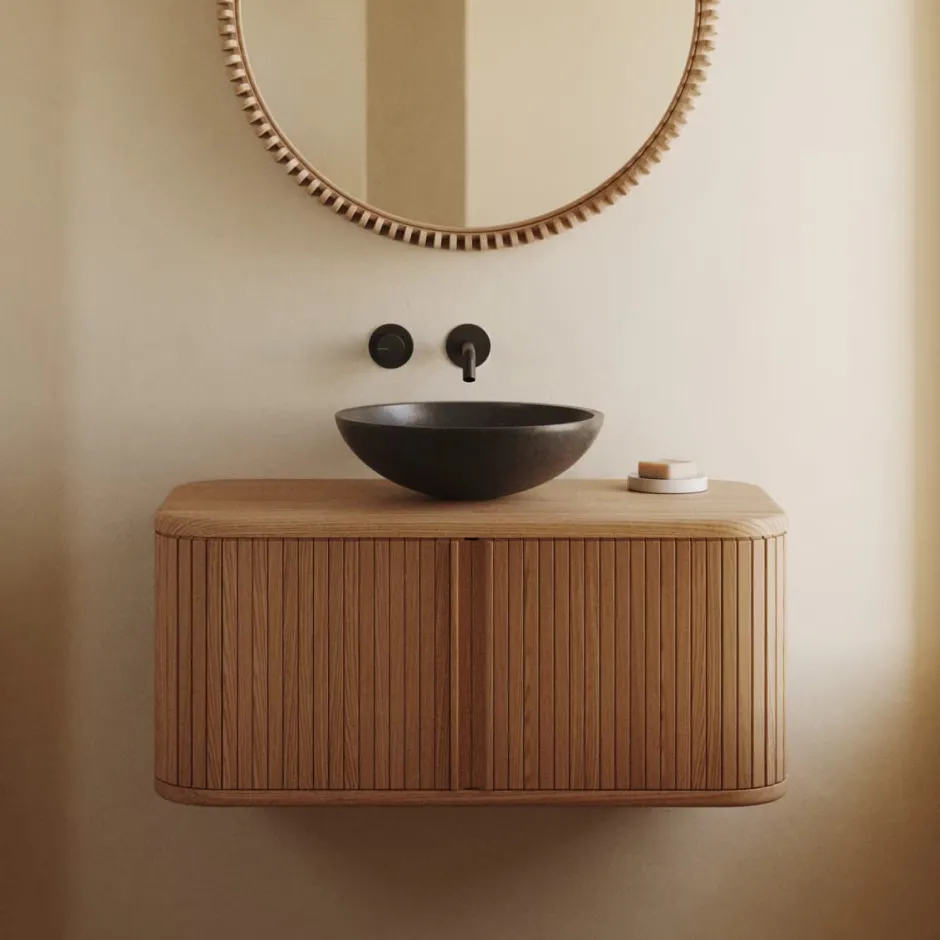 - Badkamermeubel in essenfineer met naturel afwerking.
