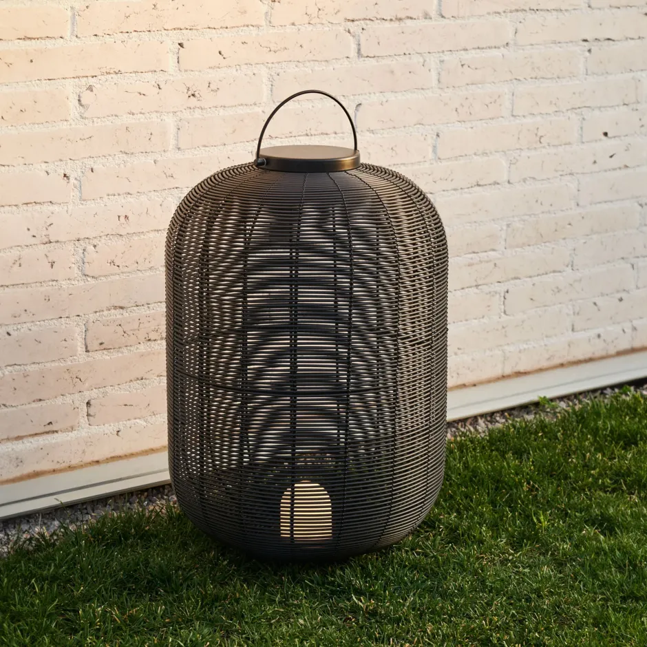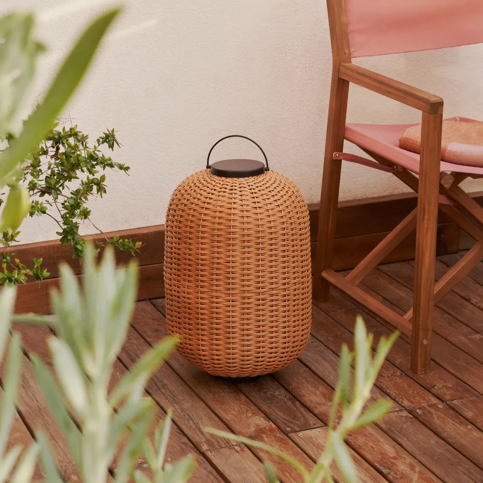 - Bruine kunststof rotanlamp met twee handvatten om in twee standen op te hangen.