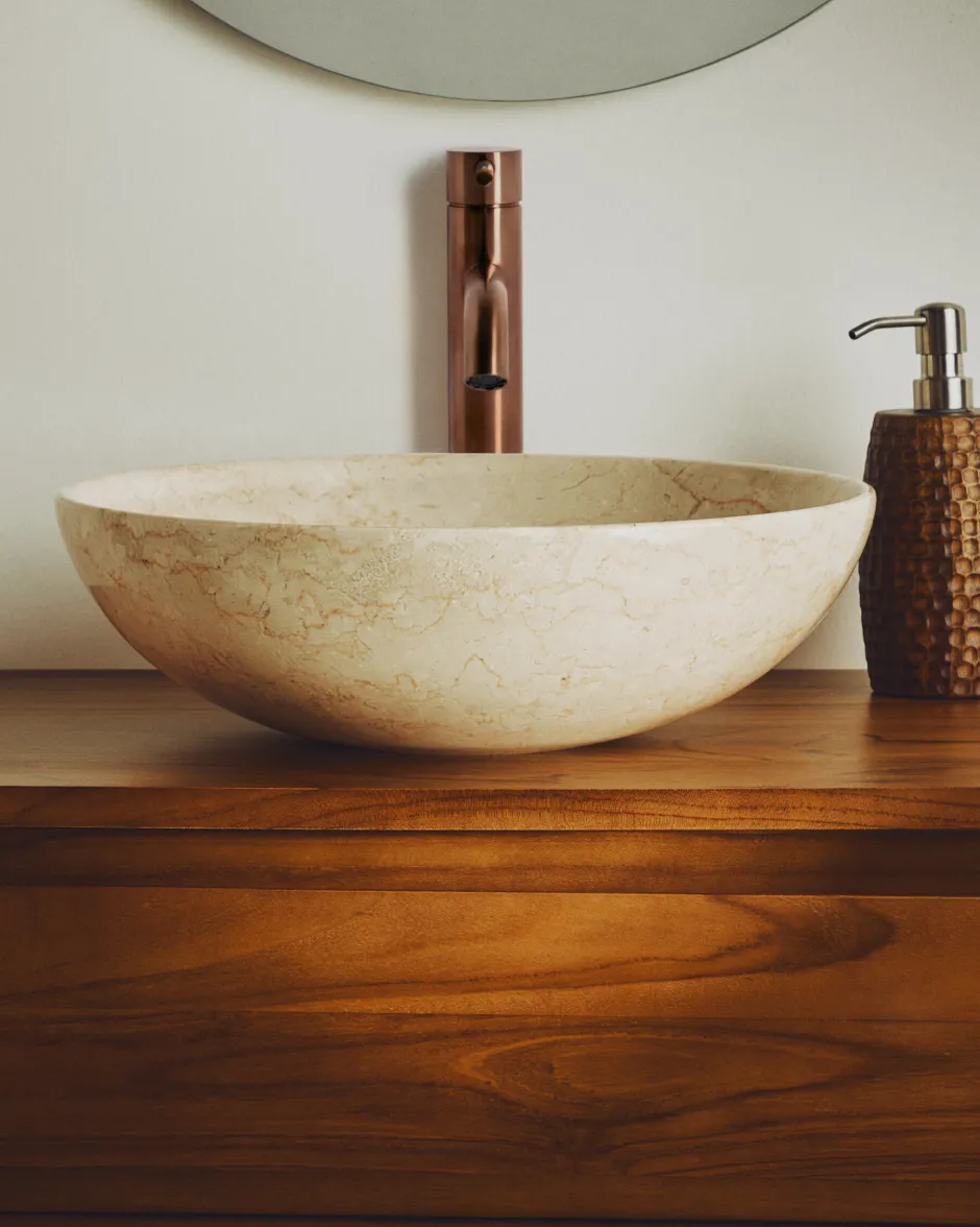 De marmeren wastafel is een uniek product dat met de hand is gemaakt van marmer dat rechtstreeks afkomstig is van het eiland Java. Elk exemplaar is zorgvuldig gevormd met traditioneel gereedschap, waardoor het unieke aderen en kleurschakeringen krijgt: de esthetische waarde van imperfectie, typisch voor dit materiaal. De gepolijste afwerking, zowel aan de binnen- als aan de buitenkant, versterkt de glans van de steen en versterkt de organische elegantie van het blad. De massieve samenstelling van marmer zorgt voor een hoge weerstand en duurzaamheid, zelfs in vochtige omgevingen en intensief gebruik, zoals in de badkamer.
