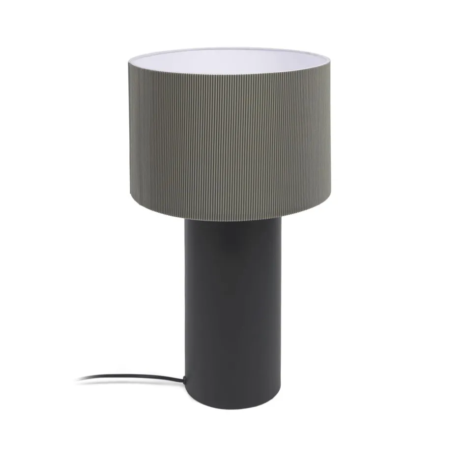 - Metalen tafellamp met zwarte afwerking en grijze geplooide stoffen kap.