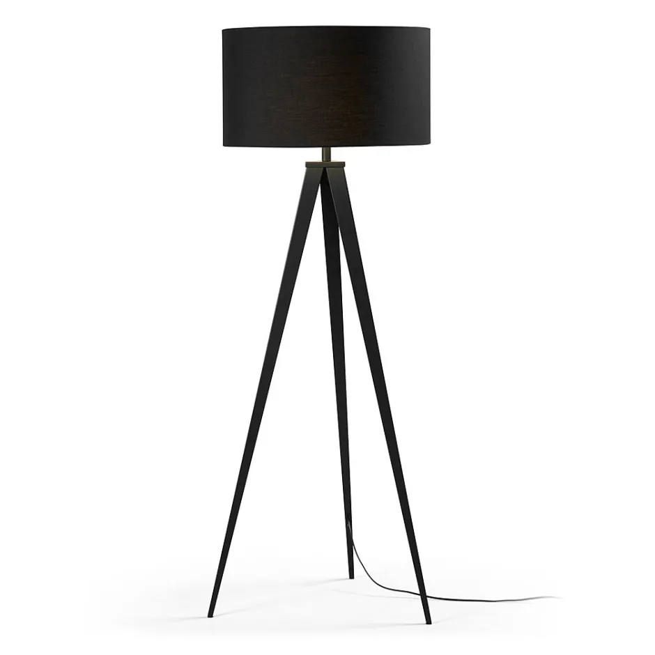 Metalen staande lampen met tripod van zwart metaal. Kap van zwarte stof. Voor E27-lamp (niet inbegrepen).