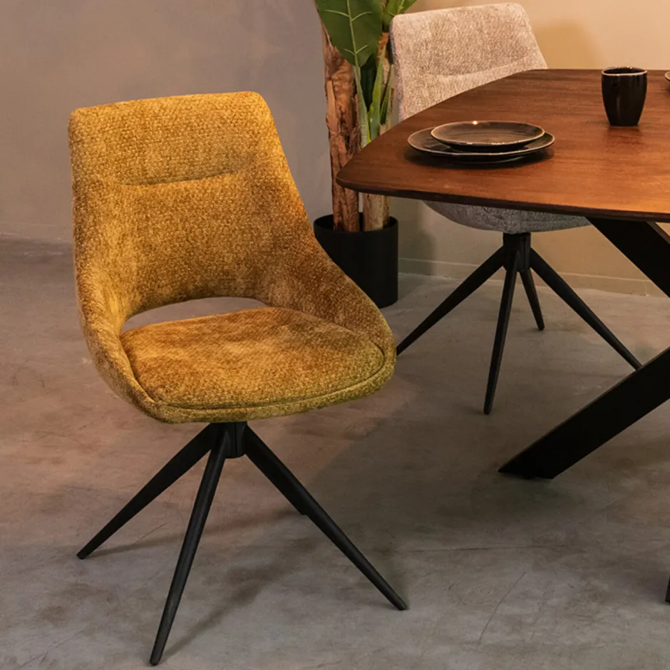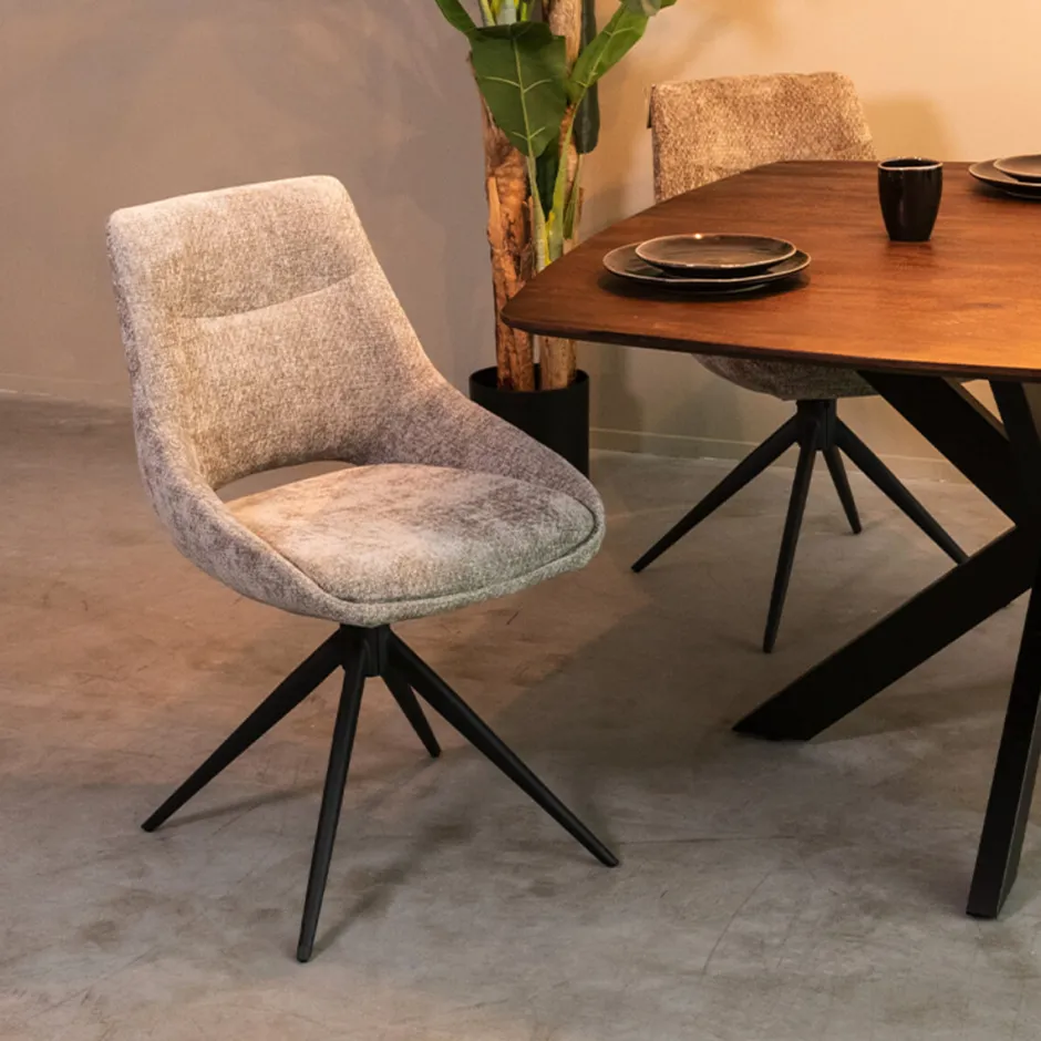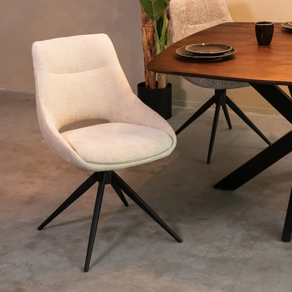 Deze eetkamerstoel biedt meer dan alleen een mooi uiterlijk. Het ergonomische ontwerp met een gebogen rugleuning biedt optimale ondersteuning tijdens lange diners of gezellige avonden aan tafel. De zitting is breed en comfortabel, en de draaibare functie maakt de stoel bijzonder functioneel. De slanke, metalen poten zorgen voor een stabiele basis en geven de stoel een moderne uitstraling zonder massief te ogen.