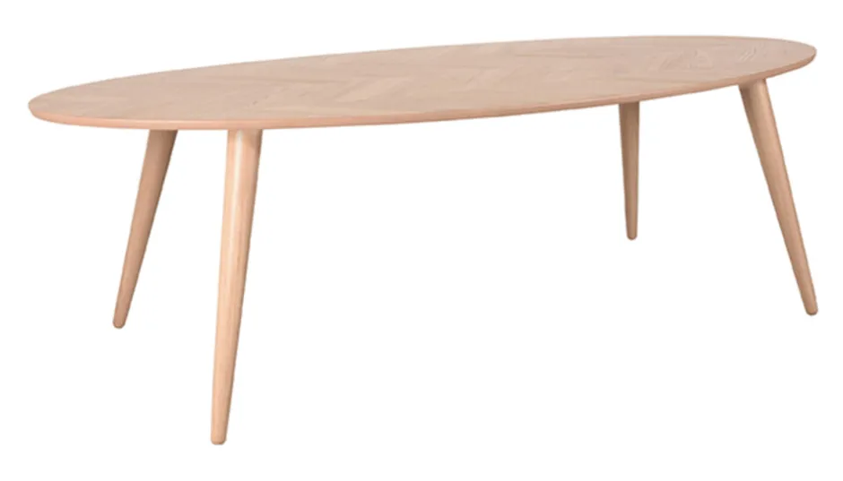 Eettafel Ines heeft een ovaal tafelblad dat rust op vier kegelvormige hoge poten. Doordat de poten licht naar binnen staan krijgt de tafel een speels accent. Het vissengraatpatroon op het tafelblad geeft de tafel een elegante uitstraling. Deze tafel past perfect in een modern en minimalistisch interieur.