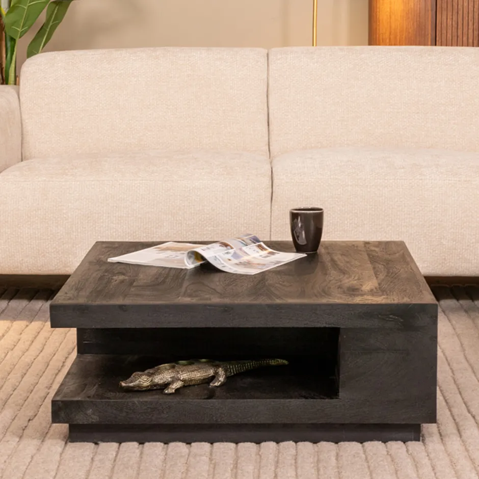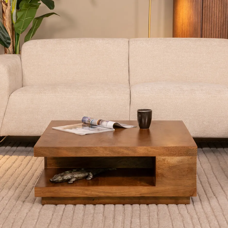 Salontafel Square heeft een vierkantgevormde basis, gemaakt van gezandstraald mangohout in de kleur Nature Smooth. Deze robuuste basis heeft een prachtige geïntegreerde vakkenindeling die ervoor zorgt dat Square wel een heel leuk uiterlijk krijgt. Daarnaast zorgt de indeling dat spullen niet direct in het zicht liggen, maar je deze wel lekker bij de hand hebt. De vakkenindeling is aan beide zijden, in tegengestelde positie geplaatst waardoor het meubel er aan alle zijden speels en gaaf uitziet.