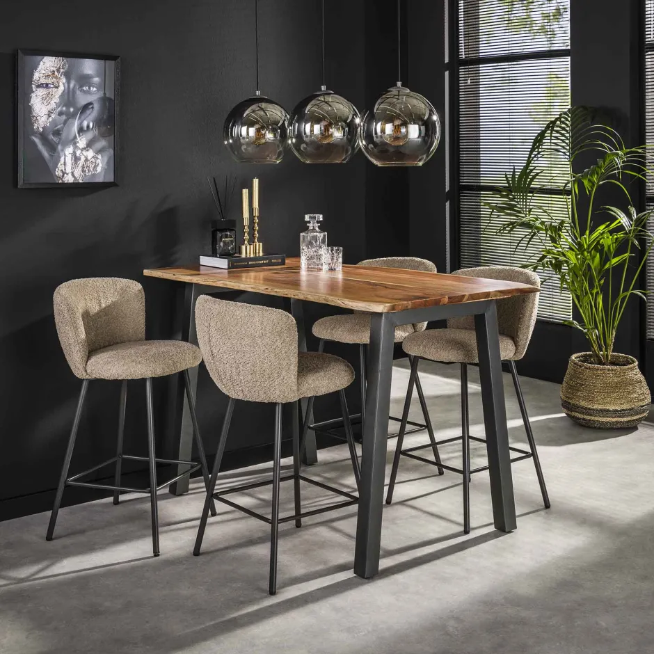 Deze bartafel is 147 centimeter lang en 80 centimeter breed. Het bovenblad, uitgevoerd in acacia, is 25 millimeter dik en heeft een boomstamvorm. Het blad is blank afgelakt, wat bescherming biedt tegen vocht en vuil. Het U-frame is grijs gepoedercoat staal en heeft een dikte van 6 centimeter.
