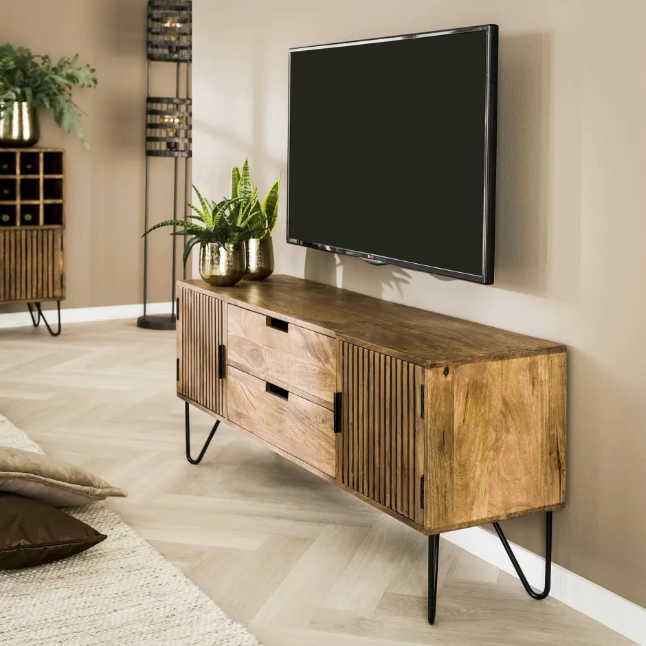 Dit TV-meubel is uitgevoerd in mango hout met een zandkleur finish. Het TV-meubel beschikt over 2 lades en 2 deuren. De spijlen op de de deuren geven dit meubel een ambachtelijke, maar zeer eigentijdse look. Dit TV-meubel is qua breedte geschikt voor een televisie tot 55 inch.