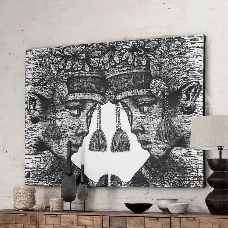 De muur decoratie van het Nederlandse lifestyle merk MUST Living is authentiek en opvallend. Op dit canvas is een tweeling met traditionele kleding, afkomstig van het Indonesische eiland Bali, afgebeeld. Het canvas heeft een afmeting van 110×150 cm.