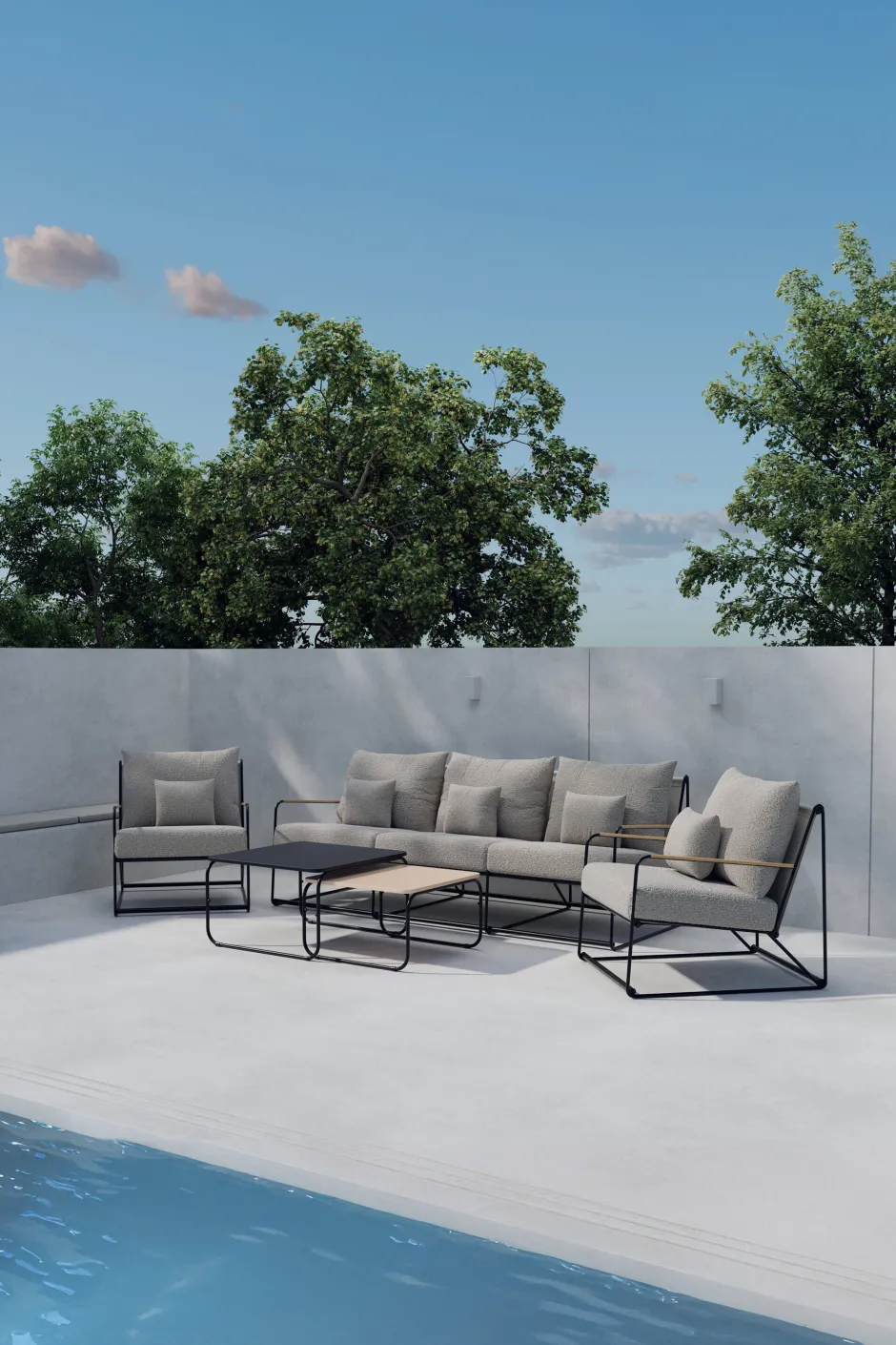 De Markesha-bankstel is een stijlvolle en ruime meubelset met een zwart frame en zachte beige kussens. De set bestaat uit een driezitsbank, twee fauteuils en twee bijpassende tafels, waardoor je een complete en gezellige lounge-ervaring krijgt. Het strakke ontwerp met strakke lijnen en het contrast tussen het donkere frame en de lichte kussens geven het een moderne uitstraling die perfect past bij je terras, tuin of serre. De Markesha-bankstel is de perfecte keuze voor wie op zoek is naar een combinatie van comfort, kwaliteit en tijdloos design.